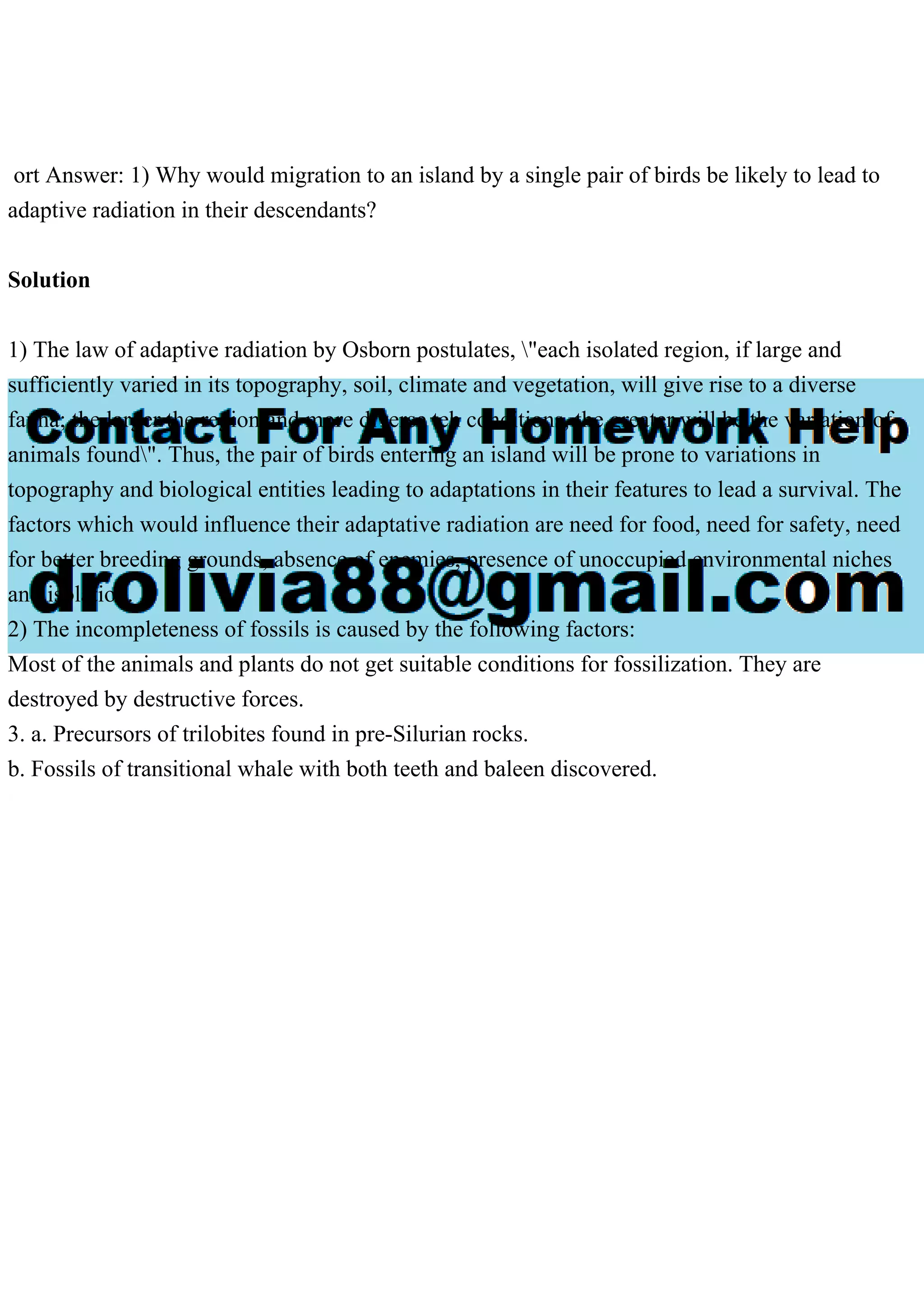 Migration of a single pair of birds to an island can lead to adaptive radiation due to the diverse conditions that promote variations for survival, influenced by factors like food needs, safety, and environmental niches. Additionally, the incompleteness of fossils arises from the rarity of suitable fossilization conditions and destructive forces. Examples include precursors of trilobites in pre-Silurian rocks and transitional whale fossils with both teeth and baleen.