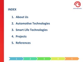 The document provides an index and overview of an electronics company that focuses on automotive technologies, smart home technologies, and custom solutions. The company was founded in 1998 and has grown to include 35 employees between production, R&D, and management. It has established quality management systems and uses SAP for ERP. The sections describe the company's history and areas, as well as products in automotive control systems, telematics, displays and recorders for vehicles. The smart home section lists product groups including management software, telemetry solutions, and custom services.