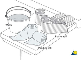This document discusses various methods of fracture treatment including traction, splinting, and plaster of Paris. It provides details on skin traction and skeletal traction, including indications, application techniques, and complications. It also outlines different types of splints and how to properly apply and care for plaster of Paris casts. The goal of these treatments is to reduce fractures, maintain alignment, and allow rehabilitation through immobilization and gradual reduction of muscular forces.