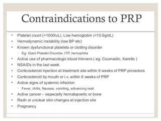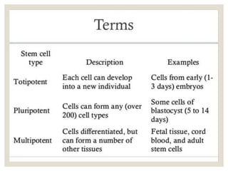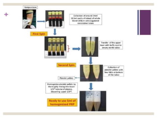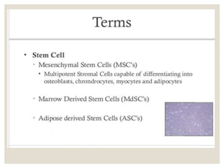 The document discusses the historical context and applications of orthobiology, particularly focusing on embryonic stem cells and biologic substances used for healing musculoskeletal conditions. It examines various biological treatments, including platelet-rich plasma (PRP) and bone morphogenic proteins (BMPs), emphasizing their roles in bone healing, regeneration, and the regulation of differentiation in stem cells. Clinical applications, mechanisms of action, and issues with traditional treatments for conditions like arthritis are also highlighted, presenting PRP as a promising alternative for managing tissue injuries.