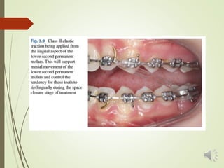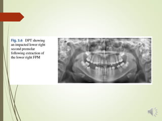 The document discusses the formation, eruption, and extraction of first permanent molars (fpms), highlighting complications such as hypomineralization, impaired eruption, and caries that can affect treatment decisions. It emphasizes the importance of structured assessments in determining the optimal timing for extractions, particularly in relation to future orthodontic treatment needs. Overall, the document outlines key principles for managing fpms in young patients and the implications for orthodontic outcomes.