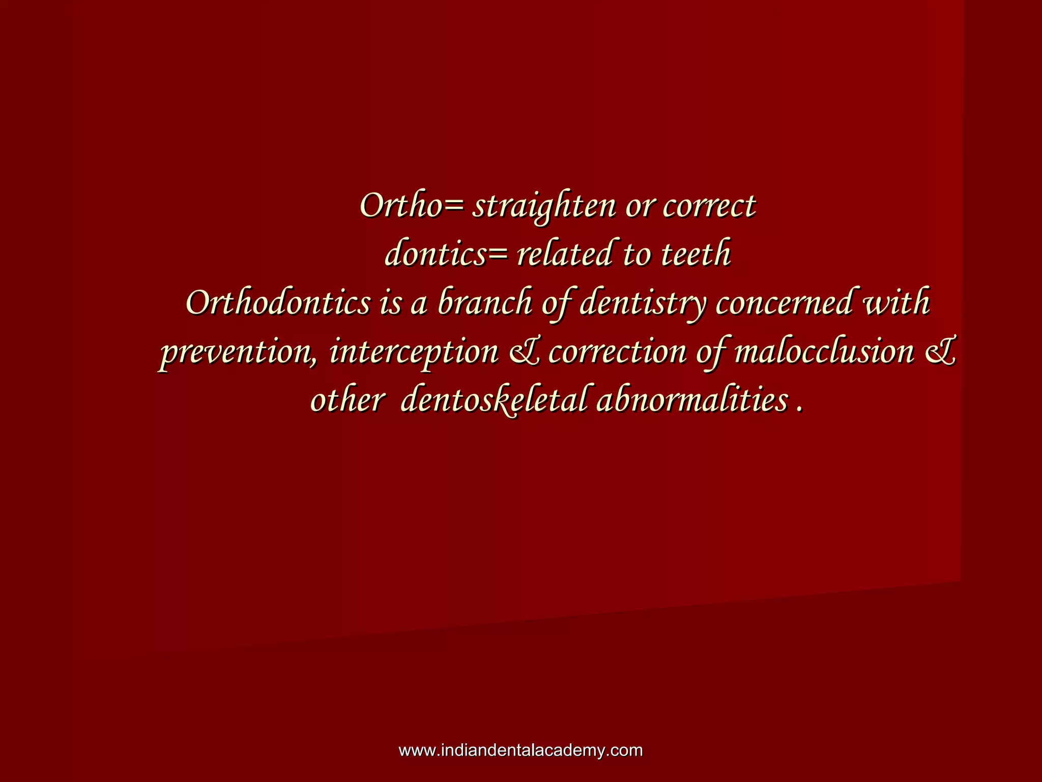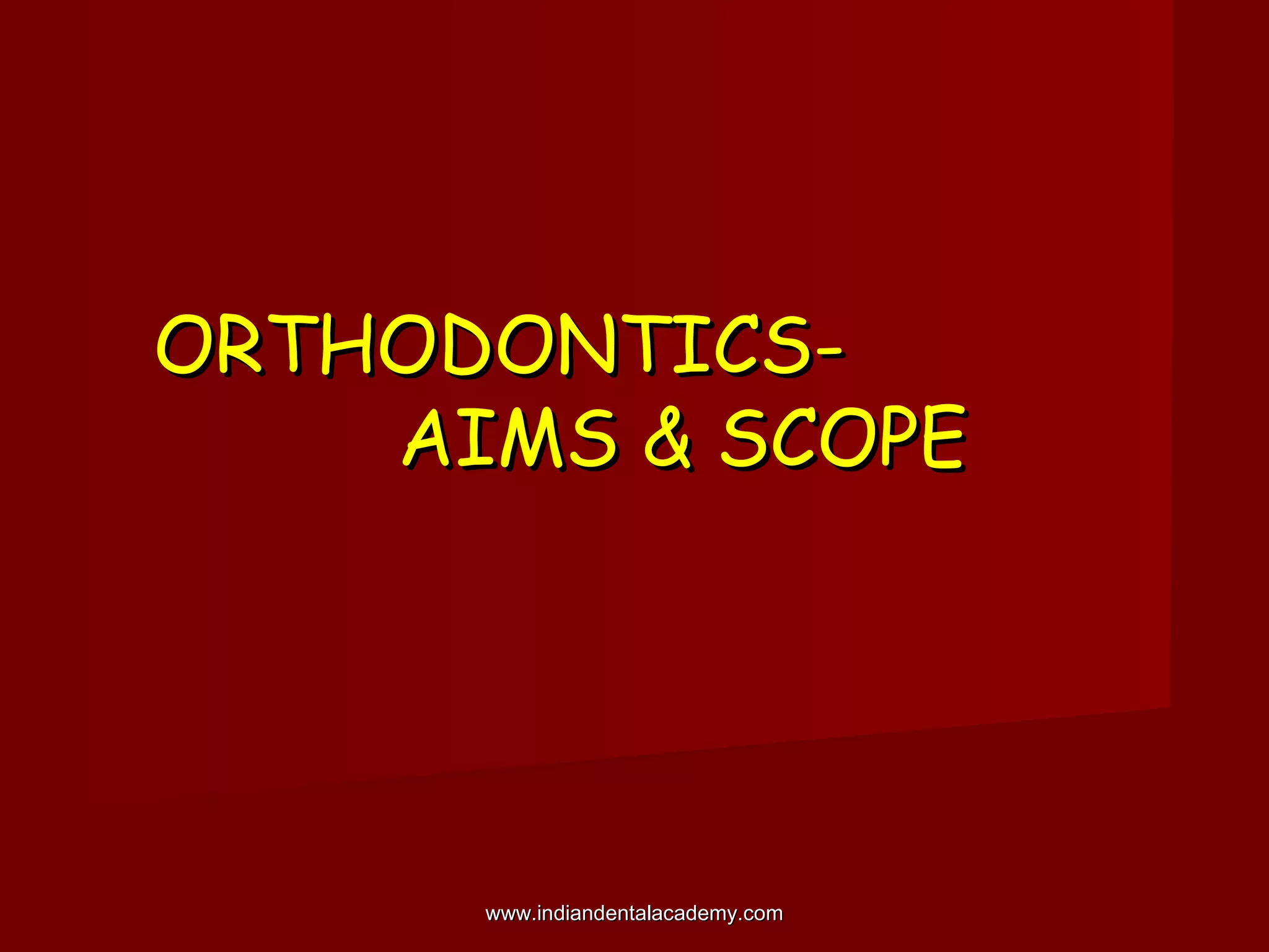 Orthodontics is a dental specialty focused on diagnosing, preventing, and correcting malocclusions and other dentofacial abnormalities, ensuring proper alignment of teeth and facial structures. It includes the application of forces to move teeth, and aims for structural balance, functional efficiency, and aesthetic harmony. The document outlines the scope of orthodontic practice, classification of malocclusions, and the importance of preventive measures in orthodontics.