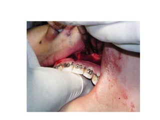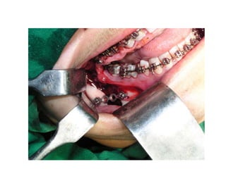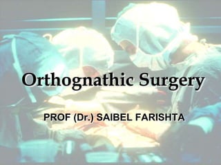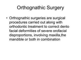 Orthognathic surgery involves surgical procedures to correct dentofacial deformities involving the maxilla, mandible, or both. It is carried out along with orthodontic treatment. Indications include severe class II or III malocclusions, deep overbites, open bites, vertical excess or deficiency, asymmetry, and compromised periodontal health. The goals are optimal facial and dental aesthetics, functional occlusion, future oral health, rapid treatment, stability, and minimal morbidity. Treatment requires joint planning by an orthodontist and oral surgeon, including presurgical orthodontics, surgical splint fabrication, and sagittal, transverse, or vertical surgical procedures like le fort osteotomies or sagittal split