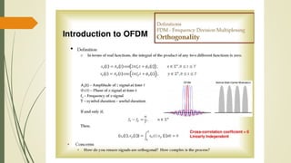 The document discusses Orthogonal Frequency Division Multiplexing (OFDM), its principles, and applications in technologies such as ADSL and digital broadcasting. It explains the process of spreading transmitted data over multiple orthogonal carriers, the necessity of cyclic prefix insertion to mitigate interference, and the application of Fast Fourier Transform (FFT) for signal processing. Details are provided on the implementation of OFDM systems, including challenges related to intersymbol and inter-carrier interference.