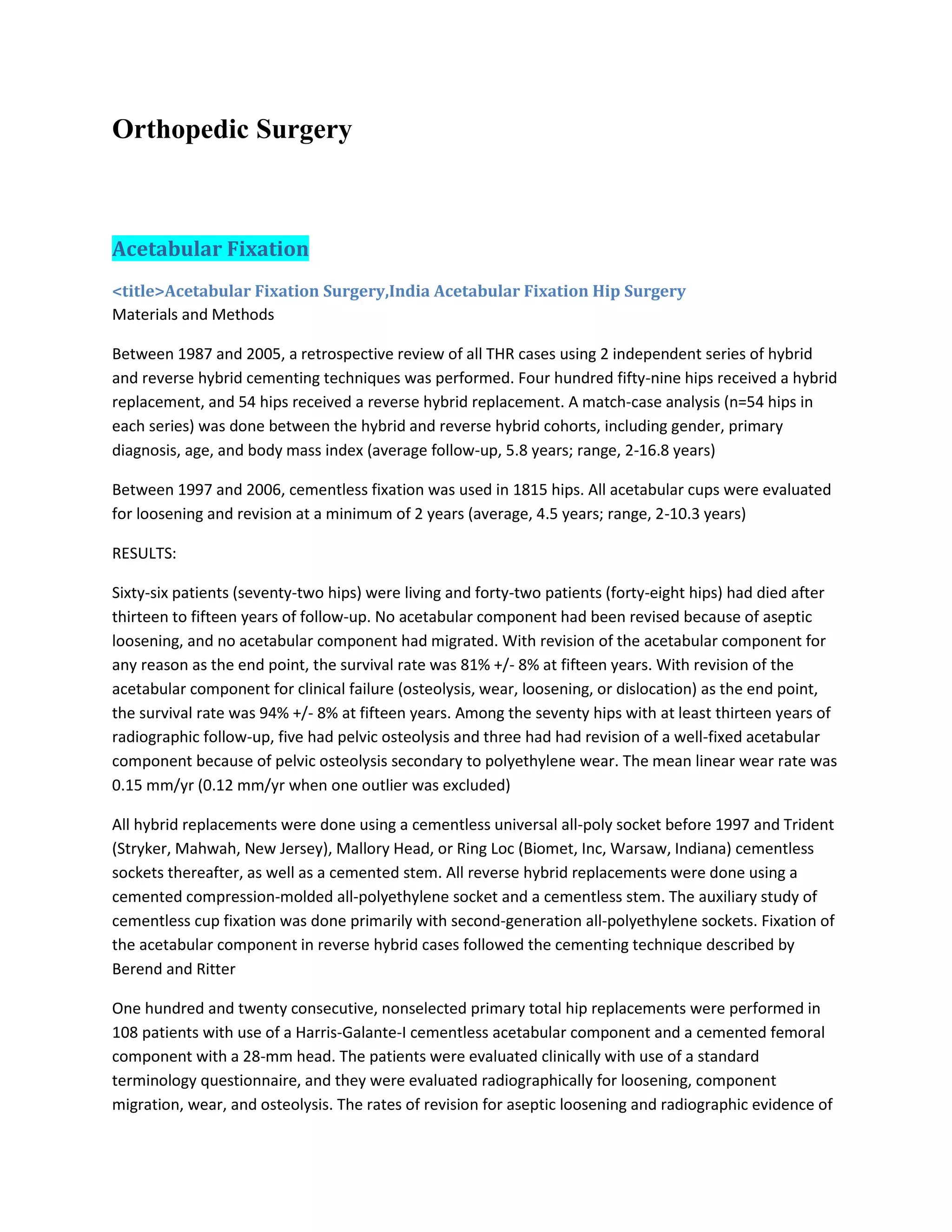 The document reviews various orthopedic surgical procedures such as acetabular fixation, arthroscopy, and simultaneous bilateral hip replacements, presenting data from retrospective studies on outcomes, complications, and survival rates over long-term follow-ups. It highlights the effectiveness of hybrid and reverse hybrid techniques in hip surgeries with substantial patient survival and low revision rates. Furthermore, it discusses advancements in surgical methods and materials, particularly for younger and more active patients, emphasizing the benefits of techniques like Birmingham Hip Resurfacing.
