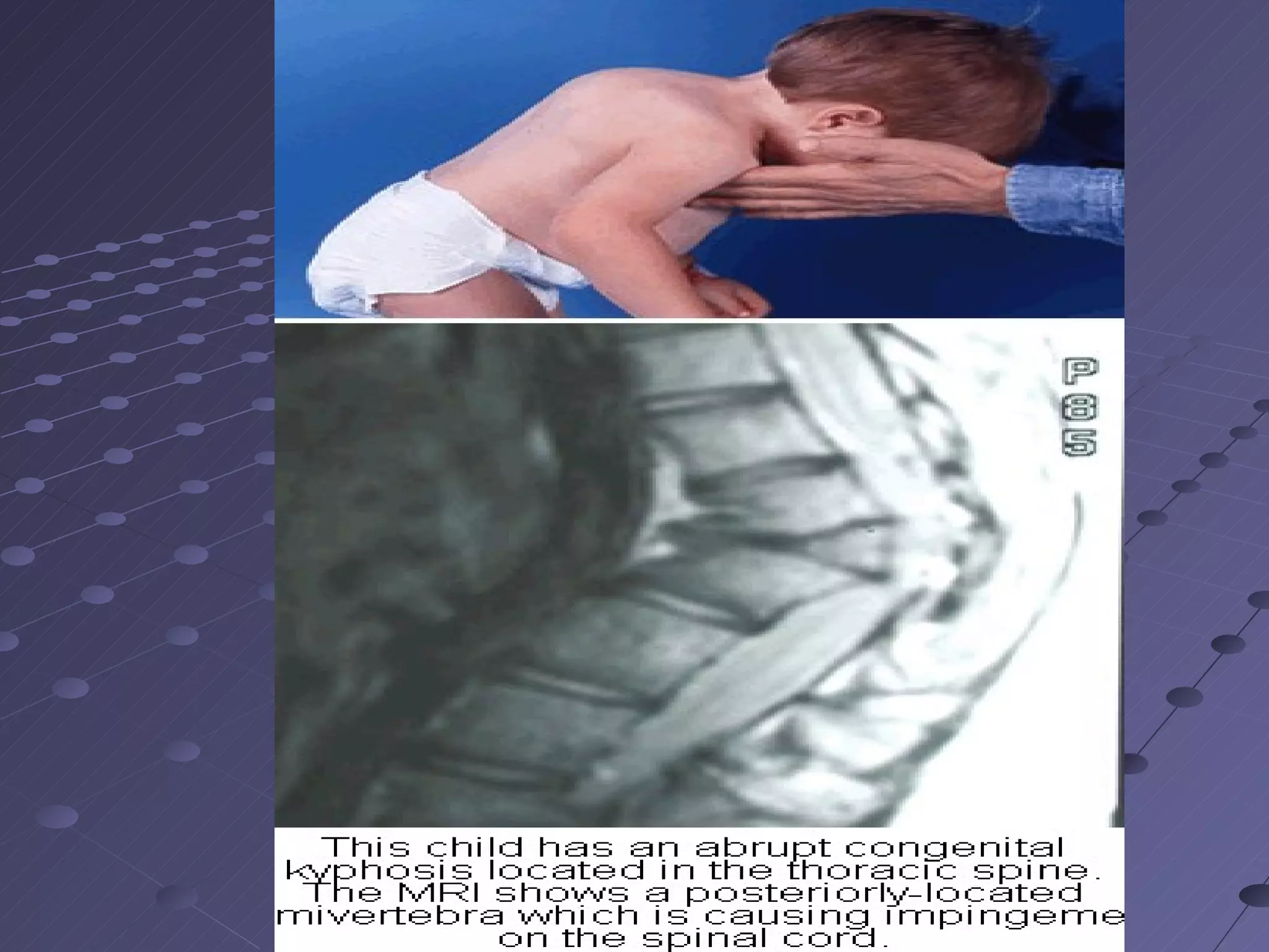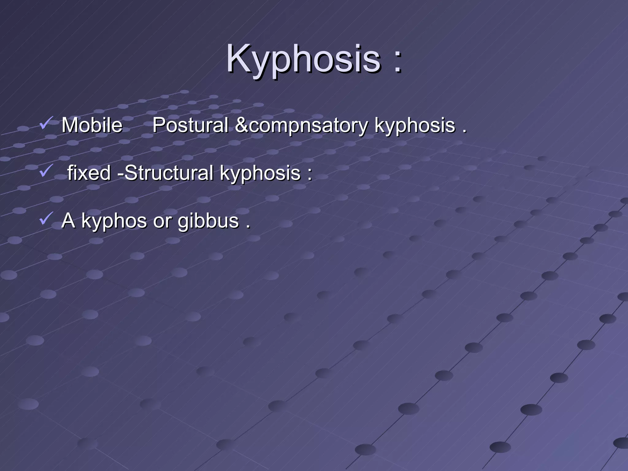 The document discusses different types of kyphosis (abnormal curvature of the spine), including congenital kyphosis, adolescent kyphosis, kyphosis in the elderly, and postural kyphosis. It covers the clinical features, investigations like x-rays and MRI, differential diagnoses, and treatment options for surgical and non-surgical management of kyphosis. Infections of the spine like tuberculosis are also discussed in terms of their pathology, clinical presentation, investigations, and treatment with antibiotics and surgery.
