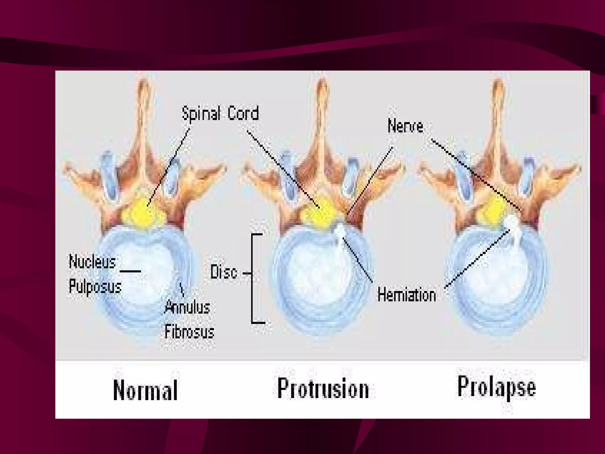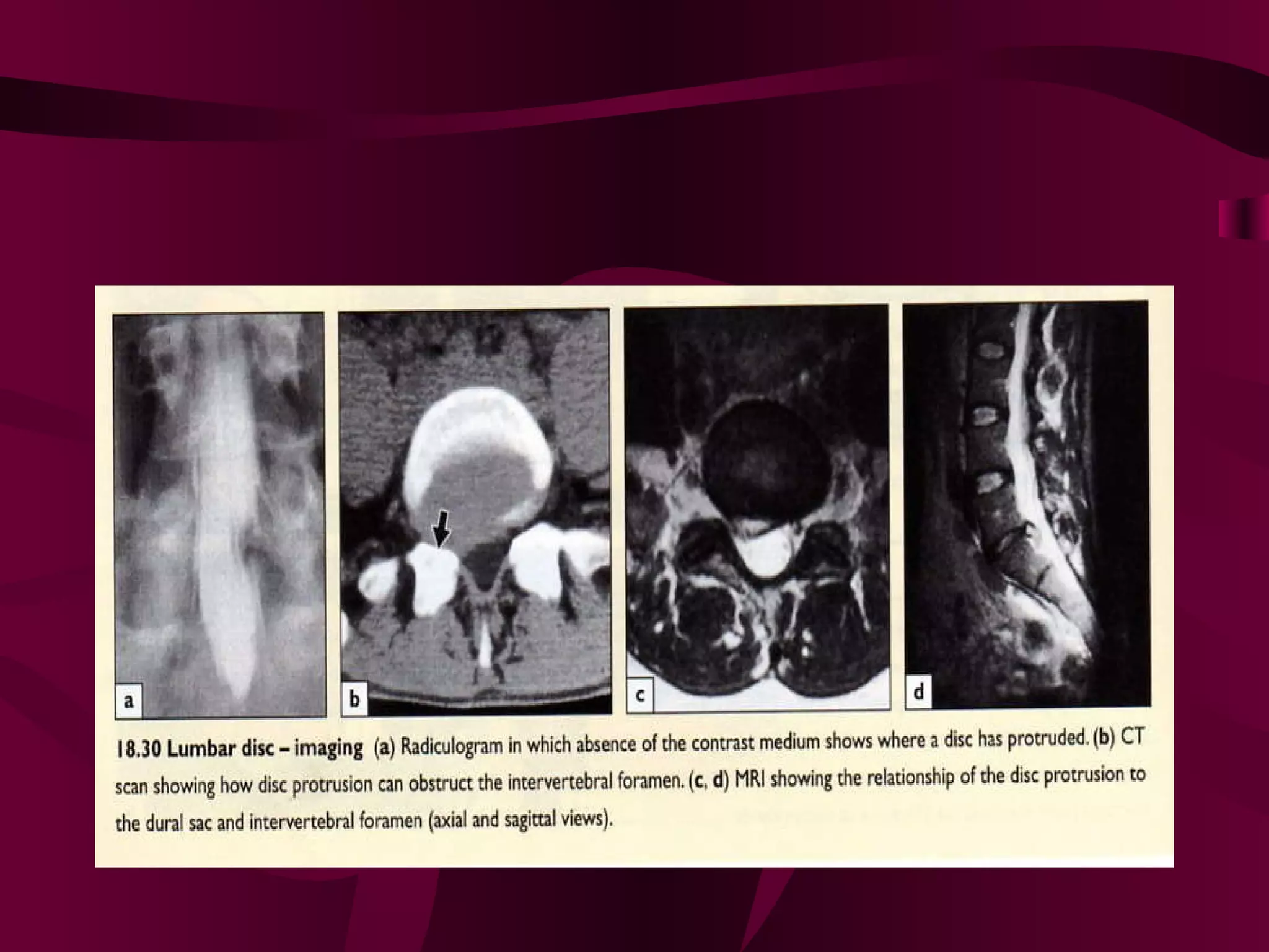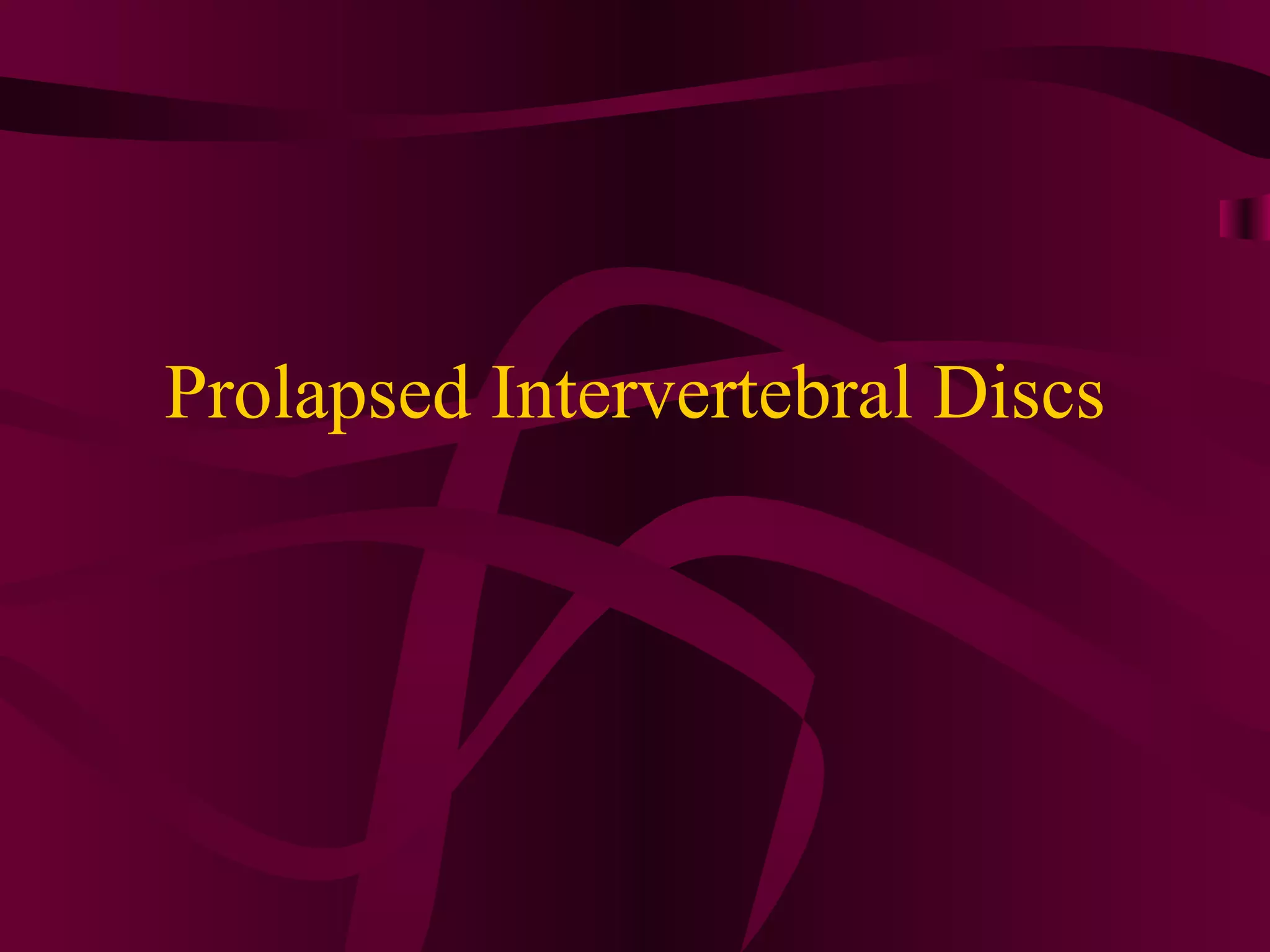 Prolapsed Intervertebral Discs can be caused by chronic degeneration from normal aging or acute disc herniation which causes pain and compression effects on the nerve root. Imaging like x-rays, MRI, and CT scans are used to diagnose the condition. Treatment options include rest, gentle massage, bracing, anti-inflammatory medications, epidural blocks, and surgery like microdiscectomy if conservative treatments fail. Surgical treatment aims to decompress the nerve root while avoiding excessive scarring and early mobilization is emphasized.