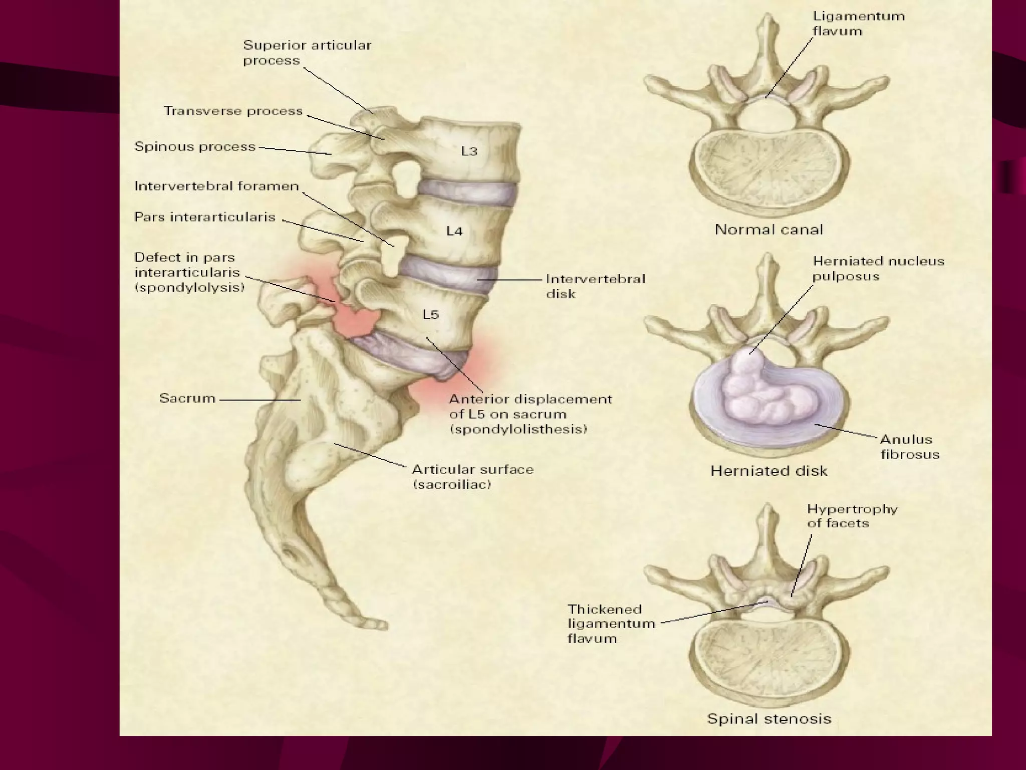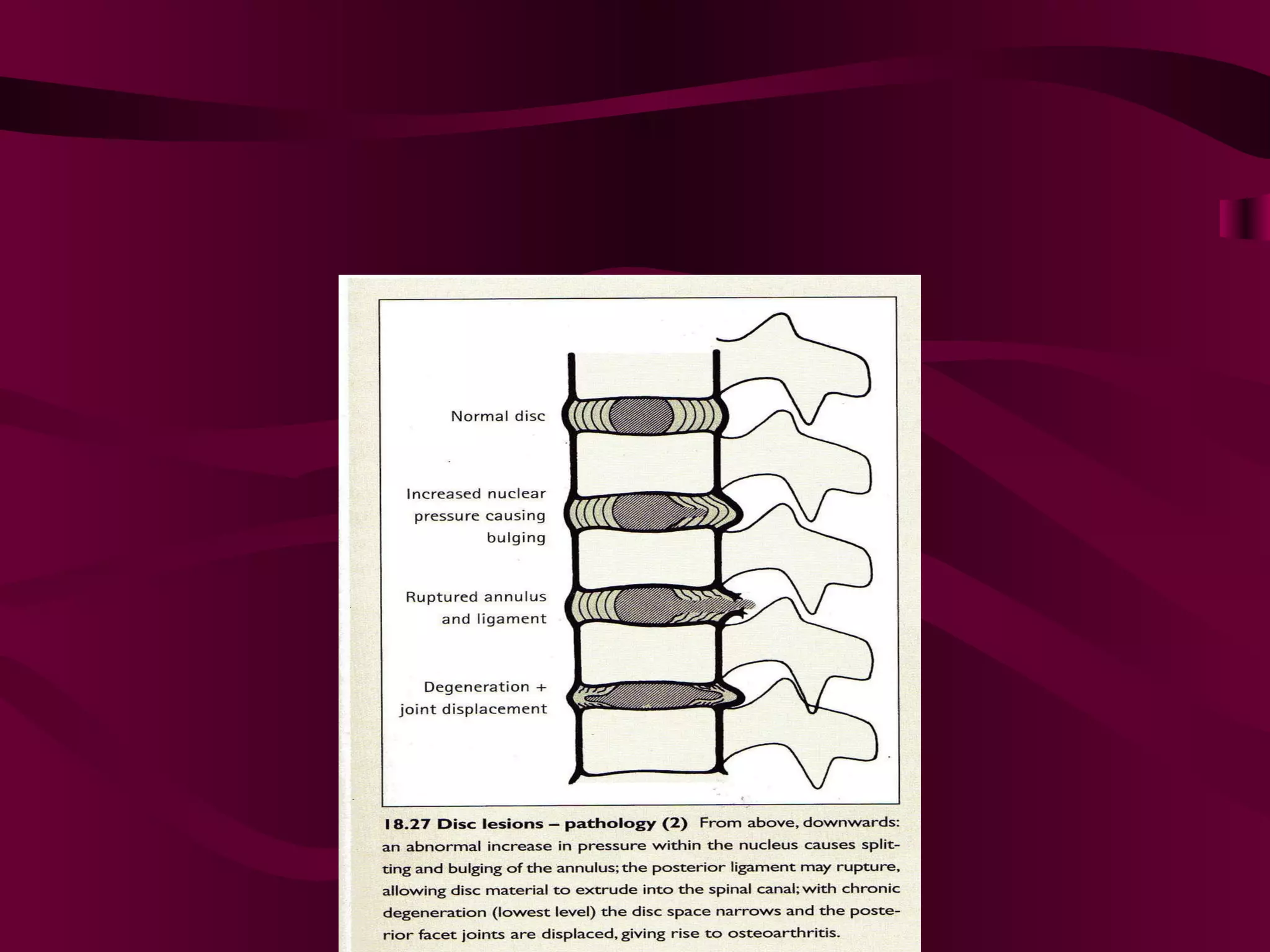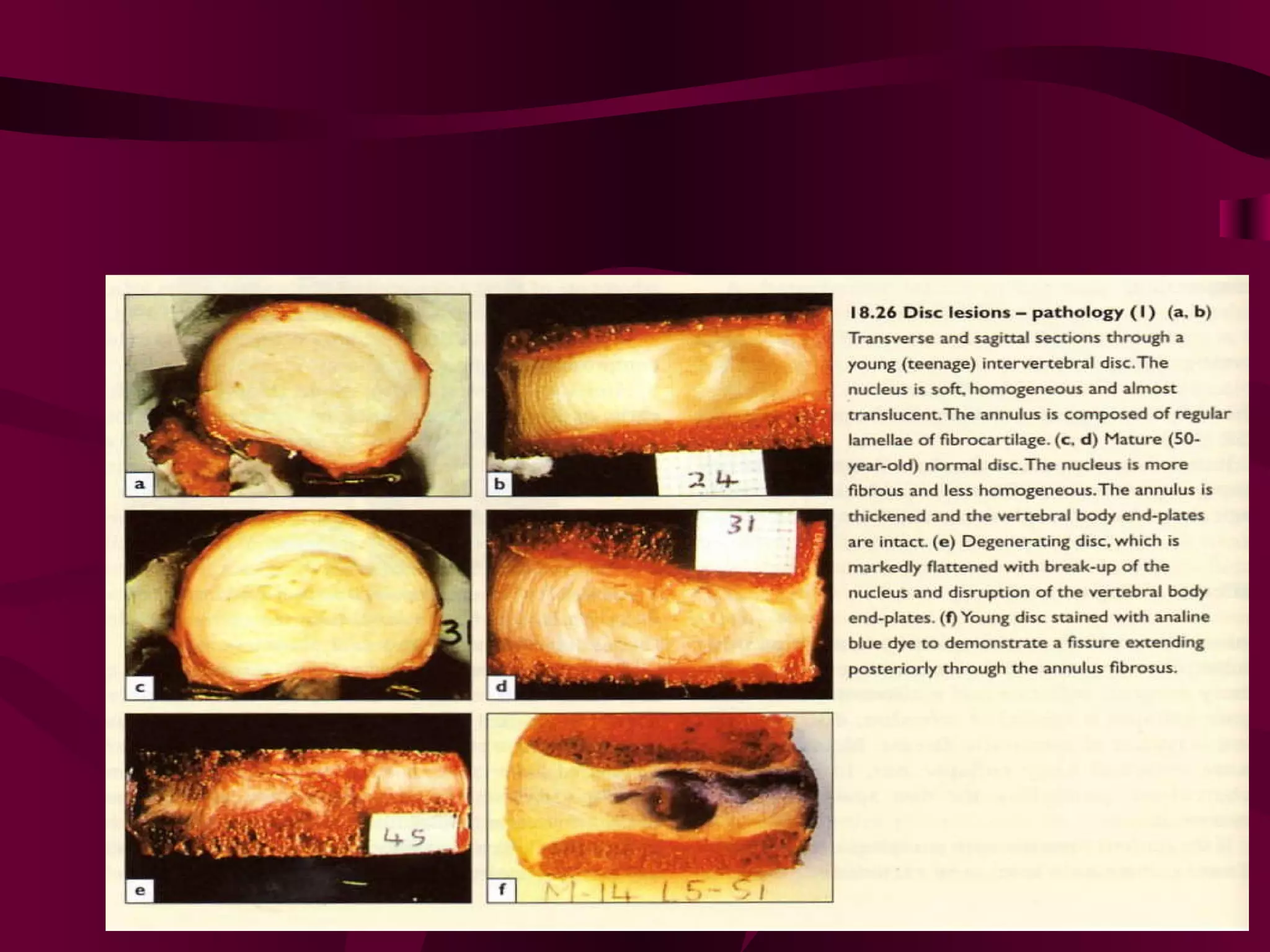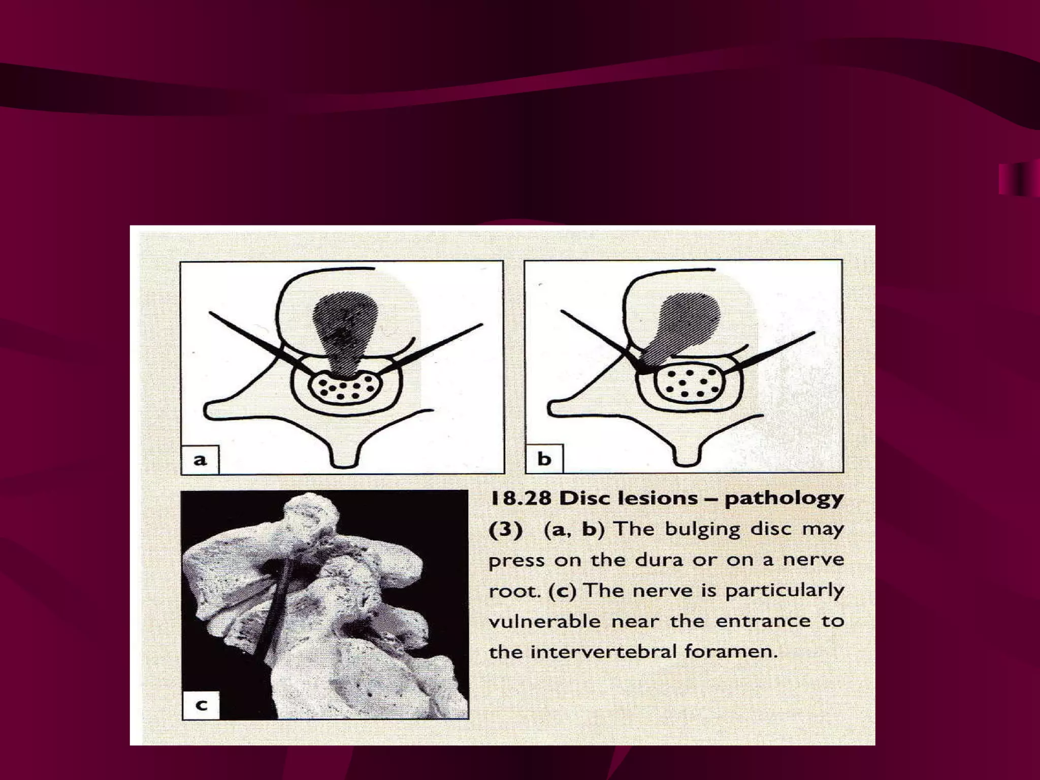 Prolapsed Intervertebral Discs can be caused by chronic degeneration from normal aging or acute disc herniation which causes pain and compression effects on the nerve root. Imaging like x-rays, MRI, and CT scans are used to diagnose the condition. Treatment options include rest, gentle massage, bracing, anti-inflammatory medications, epidural blocks, and surgery like microdiscectomy if conservative treatments fail. Surgical treatment aims to decompress the nerve root while avoiding excessive scarring and early mobilization is emphasized.