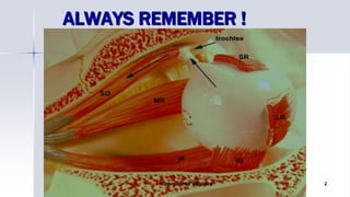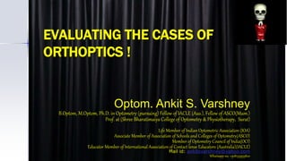 The document provides information on evaluating cases of orthoptics. It discusses evaluating a patient's history, visual acuity, eye movements, sensory status, and degree of strabismus. The evaluation includes assessing visual acuity, refraction, eye alignment using various objective tests like cover tests, assessing binocularity using stereopsis tests, and determining the presence of suppression or abnormal retinal correspondence. The document outlines the various tests used to evaluate motor and sensory functions in patients with strabismus.
