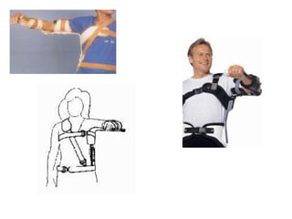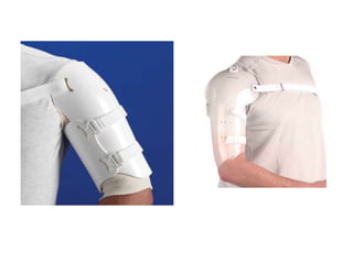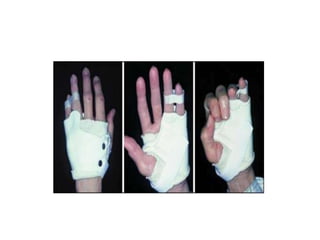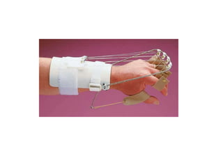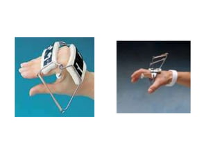 Orthoses are externally applied devices that modify the structural characteristics and function of the neuro-musculoskeletal system. They are used to immobilize, support, correct deformities, assist weak muscles, and substitute for absent motor function. The document discusses various types of orthoses for the upper limb including static/dynamic orthoses for the shoulder, elbow, wrist, hand, and fingers. It provides examples of orthoses used to treat conditions like nerve injuries, burns, rheumatoid arthritis, and spinal cord injuries. The principles and goals of orthosis prescription for different parts of the body and medical conditions are explained.