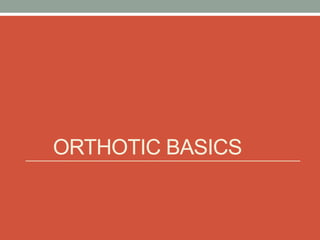 Orthotics are devices used to support or correct deformities and impairments of the foot, ankle, knee, and hip joints. A foot orthotic is customized to fit inside the shoe to correct foot alignment. An ankle-foot orthosis (AFO) consists of a shoe attachment, ankle control, and leg band to support the ankle. A knee-ankle-foot orthosis (KAFO) adds a knee control to an AFO. The most specialized orthosis is a total hip-knee-ankle-foot orthosis (THKAFO) which incorporates a hip joint and trunk band. Orthoses are customized to meet individual functional needs and goals.