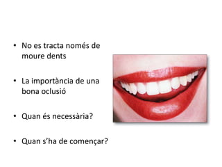 QUAN HEM DECOMENÇAR?Si el problema és esquelètic: hem de començar el més aviat possible. Aprofitar períodes de creixement.Mossegades creuades lateralsMossegades obertesClasses III esquelètiquesClasses II per hipoplasia mandibularEn casos d’alteracions antero-posteriors de l’erupció dels incisius