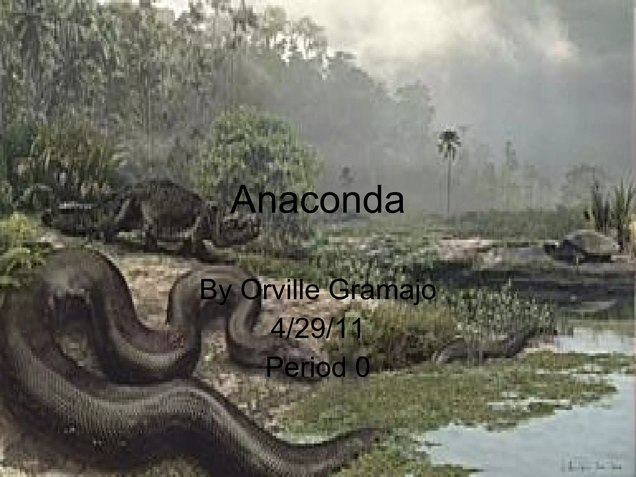 Anacondas are large, nonvenomous snakes found in tropical South America. They live in swamps, rivers, and other bodies of water near rainforests. Anacondas reach up to 35 feet in length and feed on large prey like deer, pigs, birds, and fish. They reproduce through mating balls where multiple males swarm around a single female in an attempt to breed. While anacondas are not currently threatened, loss of habitat in tropical rainforests affects their populations.
