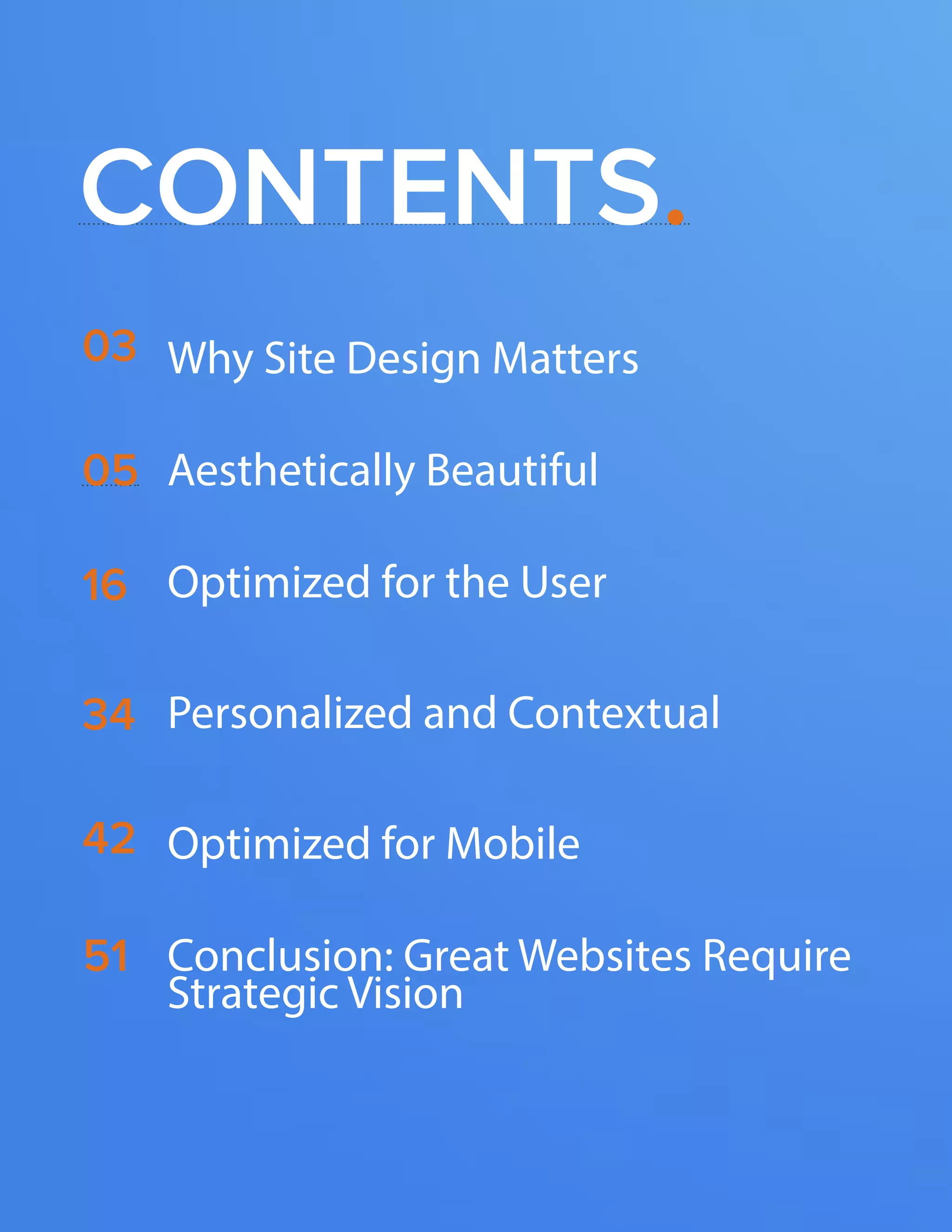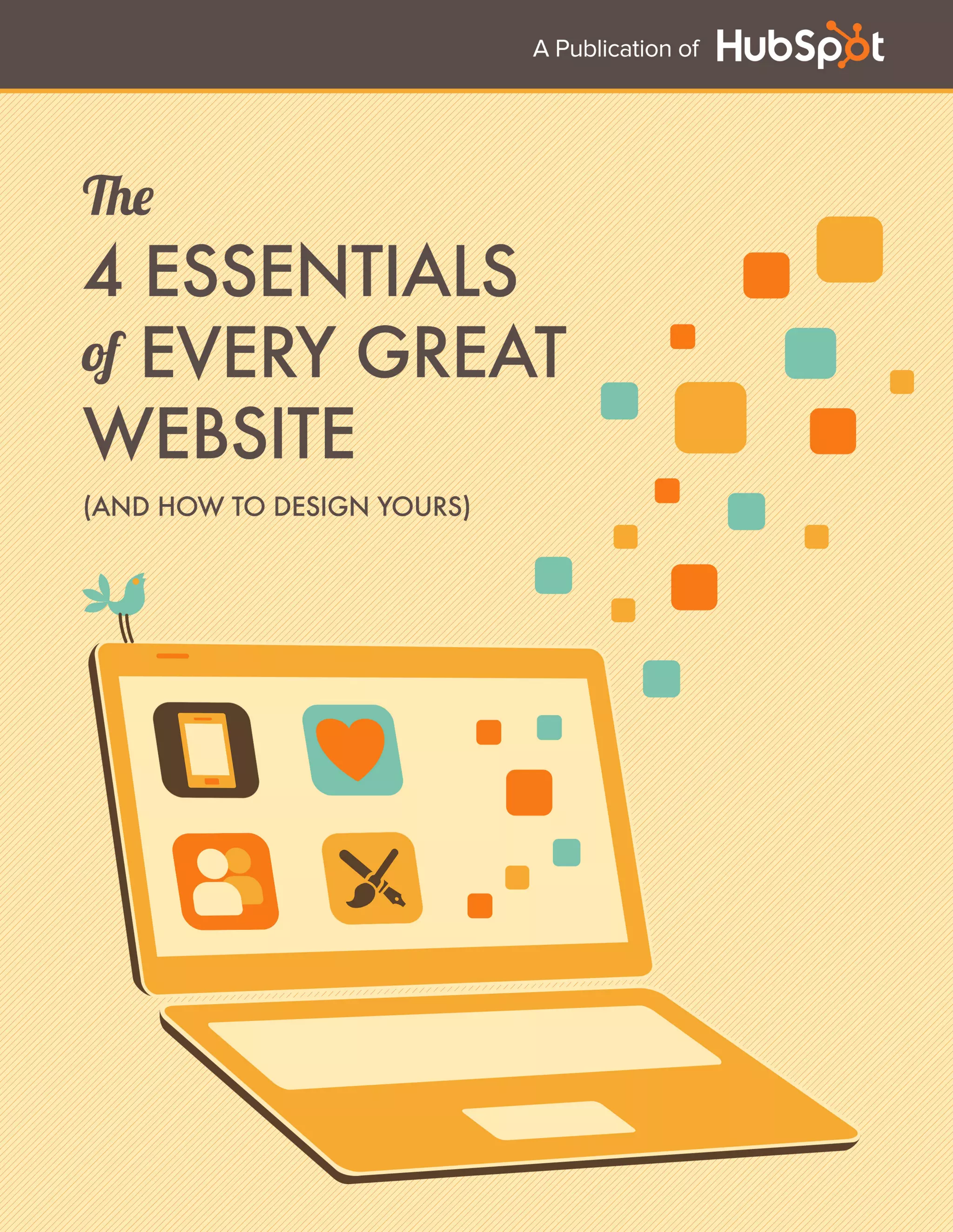 The document discusses the four essentials of great website design: aesthetically beautiful design, optimization for the user, personalization and context, and optimization for mobile. It covers how website design has evolved from static billboards to interactive platforms. Great design focuses on the user experience by using visual elements, colors, and layouts to convey the brand's personality and goals. Websites should explain their value proposition and be optimized for usability through principles like passing a "blink test" and establishing a logical thought process for users.