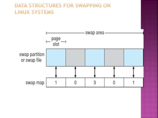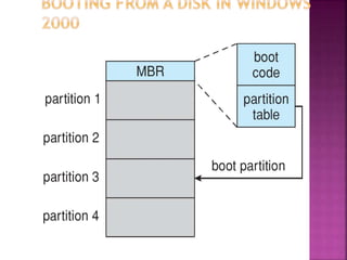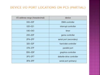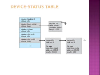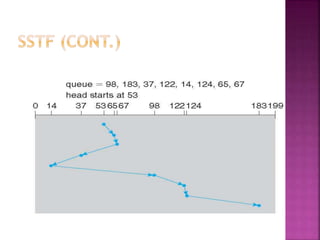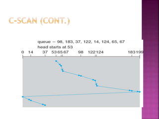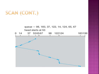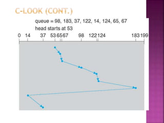 The document discusses disk drives and how they are addressed and mapped. Logical blocks on disk drives are mapped sequentially to physical sectors. Host systems access storage through I/O ports and buses like SCSI and Fibre Channel. Network-attached storage uses network protocols like NFS and CIFS. Storage area networks connect multiple hosts to multiple storage units using Fibre Channel. The operating system schedules disk I/O requests using algorithms like SSTF, SCAN, C-SCAN, and LOOK to minimize disk head movement.