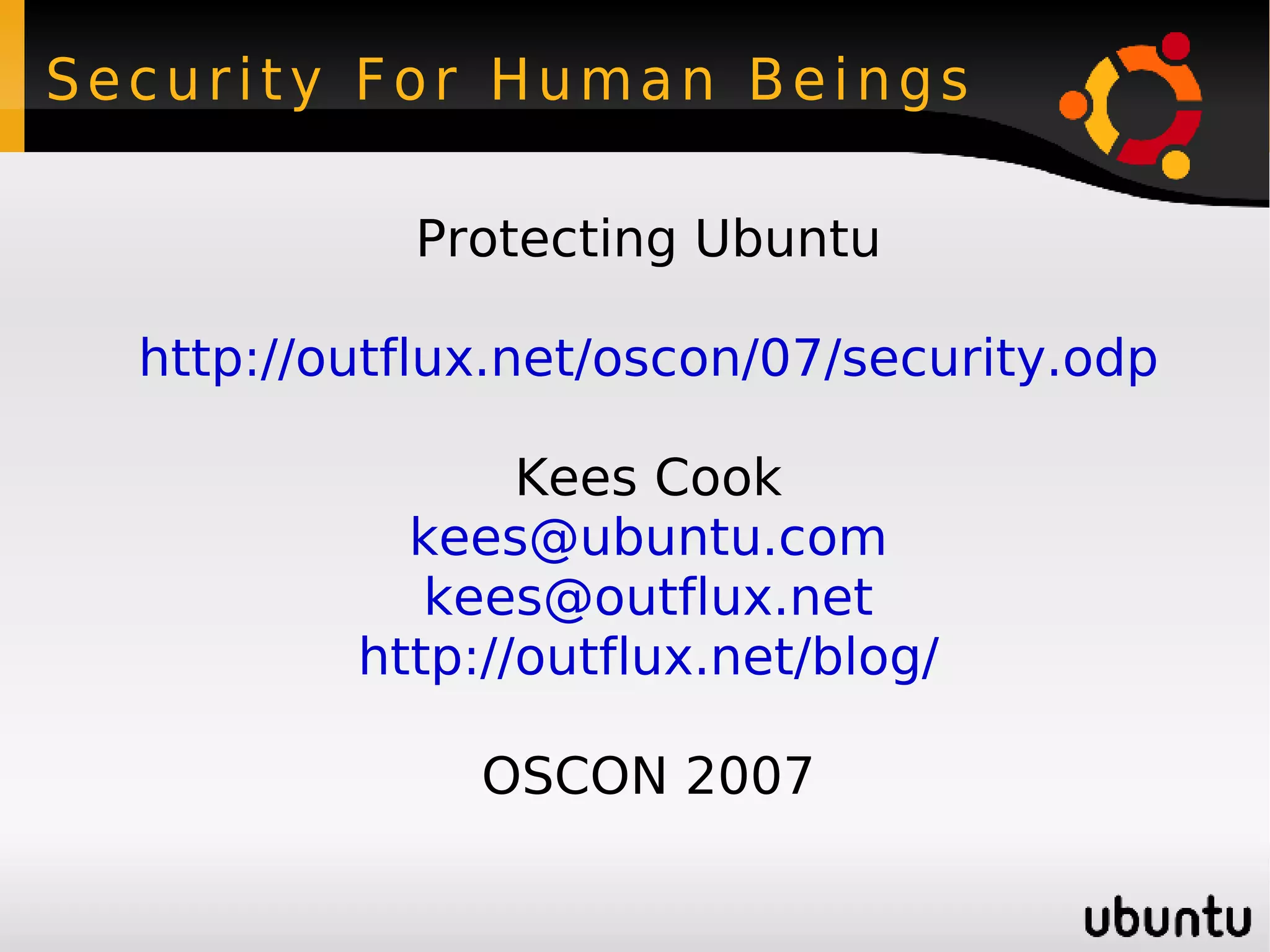 Kees Cook works to keep the Ubuntu operating system secure. His responsibilities include finding new vulnerabilities, checking mailing lists for reports of issues, performing code audits, triaging vulnerabilities by priority, finding or developing patches, testing patches, and publishing updated packages. He discussed various types of software vulnerabilities and mitigation strategies used in Ubuntu to improve security.