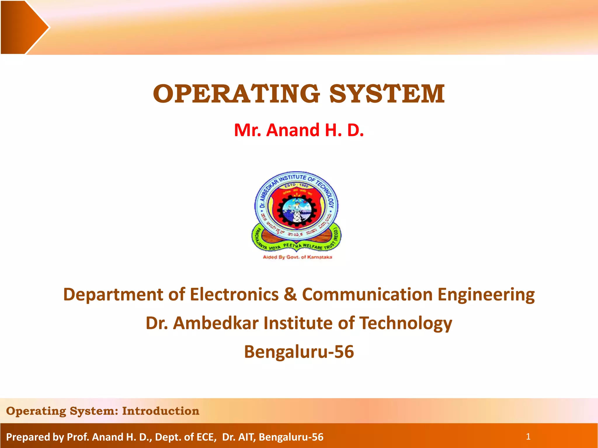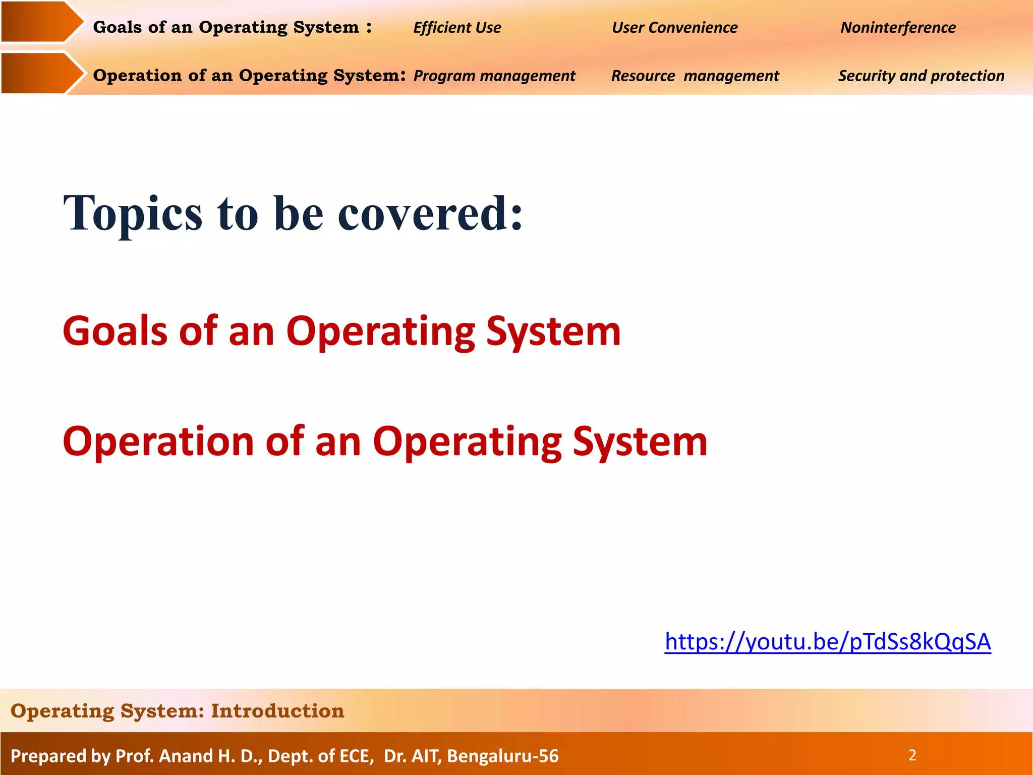 The document discusses the goals and operations of an operating system. The key goals of an operating system are efficient use of resources, user convenience, and preventing interference between users. The main operations of an operating system are program management, which involves executing and scheduling programs, resource management, which involves allocating and managing memory, CPU, and I/O devices, and security/protection which prevents unauthorized access to programs and data.