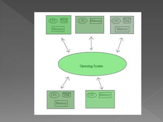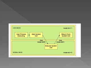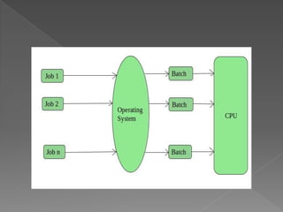 This document provides an overview of operating systems, including their objectives, components, functions, and structures. It describes what an operating system is and its main goals of executing programs, making the computer convenient to use, and using hardware efficiently. The major components covered include process management, memory management, file management, and more. Different types of operating systems are explored such as batch, time-sharing, distributed, real-time, and network operating systems. Operating system structures like monolithic and layered architectures are also summarized.