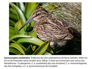 Coenocorypha aucklandica. Éndémicadas illas subantárticas de Nova Celandia. Mide uns