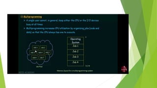 This document provides an overview of operating system structure and concepts. It discusses the components of a computer system including hardware, operating system, application programs, and users. It then describes the user and system views of an operating system. Key sections explain computer system organization, storage structure, I/O structures, operating system operations including interrupts and process management. Memory management, storage management including file systems, and mass storage management are also summarized.