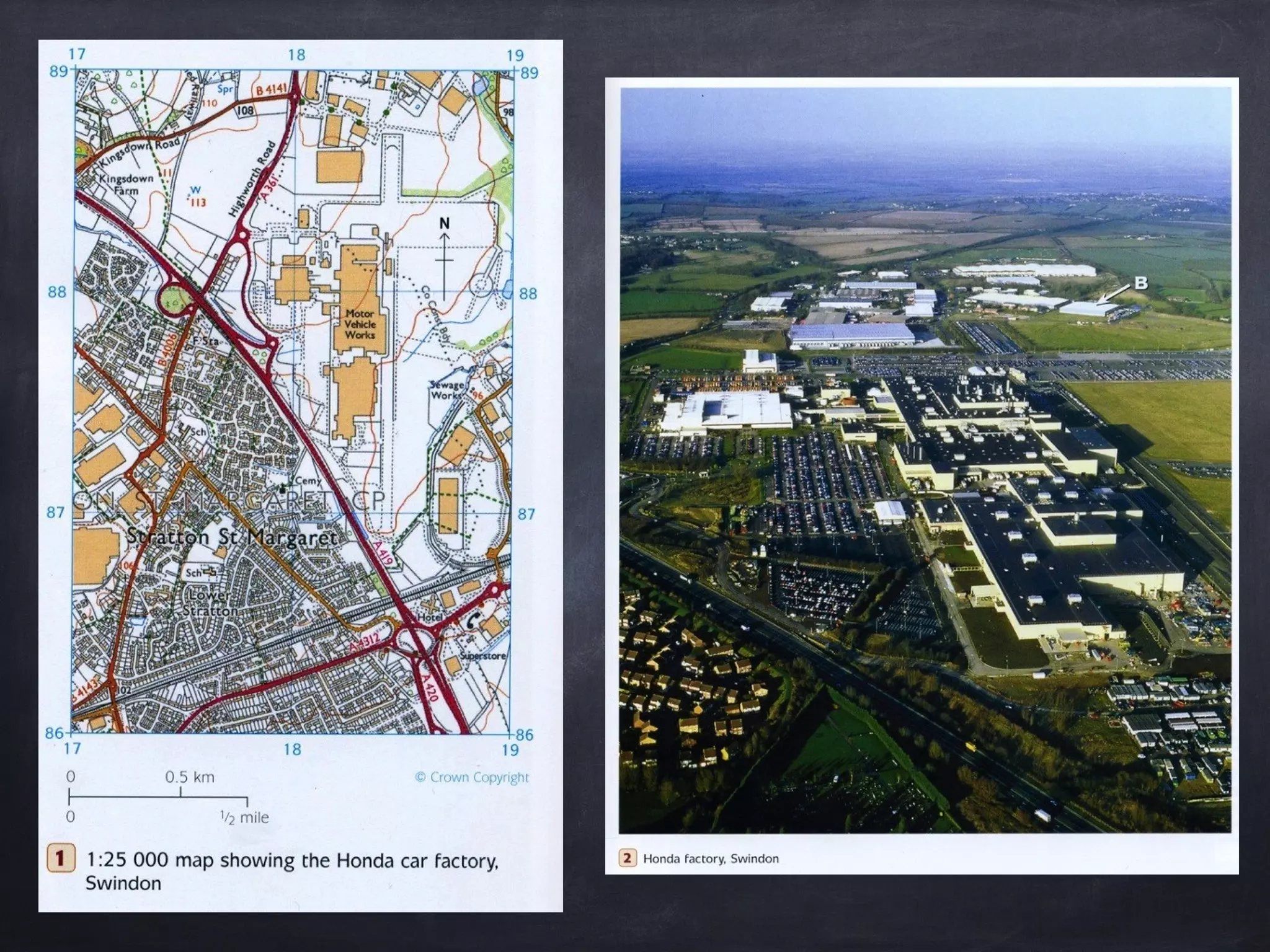 - It provides examples of using map evidence to identify features and explain the location of industries like the Honda factory in Swindon. Both advantages like new jobs and infrastructure, and disadvantages like congestion and loss of green spaces are discussed.