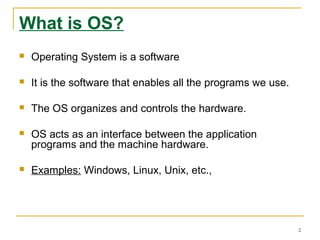 An operating system is software that enables programs to use computer hardware. It organizes and controls hardware resources and acts as an interface between programs and hardware. Operating systems perform functions like making computers more convenient to use, allowing efficient use of resources, and enabling computers to evolve without interruption. The structure of an operating system consists of four layers - hardware, the operating system software, system programs, and application programs. Early operating systems used batch processing where jobs were submitted in batches to be executed together, while later systems used multiprogramming and time sharing to allow simultaneous execution of multiple programs. Operating systems can also be classified as single-user or multi-user depending on how many users they support at once.