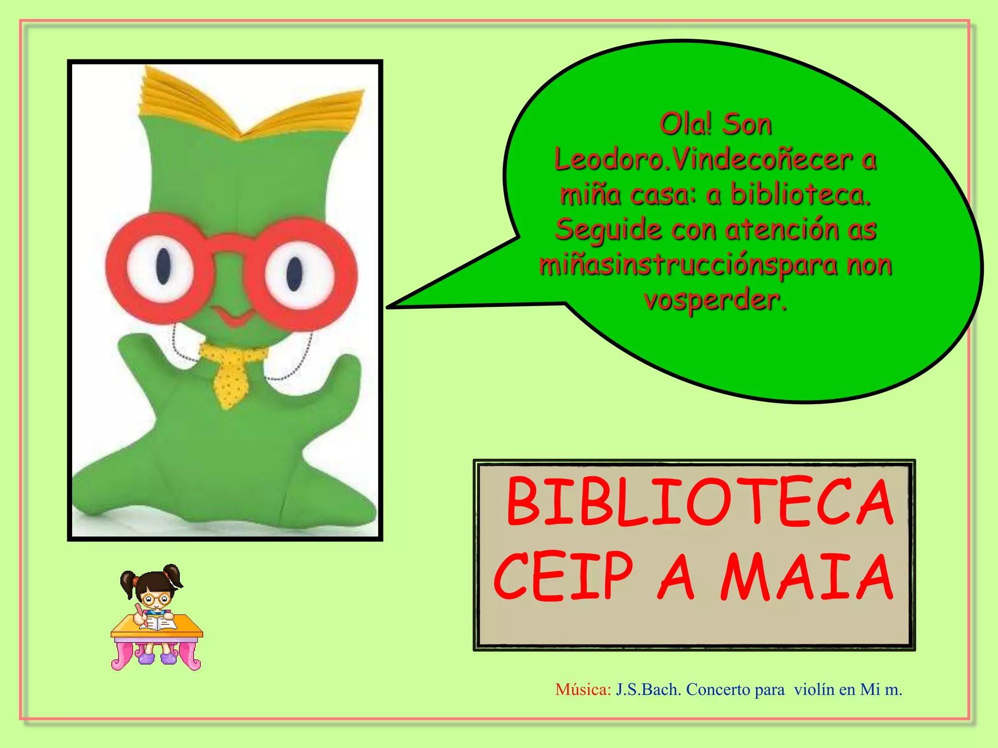 BIBLIOTECACEIP A MAIAOla!Son Leodoro.Vindecoñecer a miña casa: a biblioteca. Seguide con atención as miñasinstrucciónspara non vosperder.Música: J.S.Bach. Concerto para violín en Mi m.
