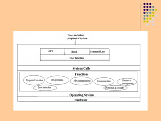 The document discusses several key services provided by operating systems, including program execution, I/O operations, file manipulation, communications, and error detection. It notes that operating systems provide functions helpful to users like user interfaces, as well as ensuring efficient system operation through resource allocation, accounting, protection, and security.