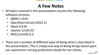 This document discusses optimizing VM images for OpenStack with KVM/QEMU. It covers disk and container formats like RAW, QCOW2, and AMI. It also discusses tools for manipulating disk files, launching an instance, image OS preparation using cloud-init, authentication models, networking configuration, and hotplug support. The goal is to provide optimized images that support features like snapshots while allowing faster instance launching and increased storage efficiency.