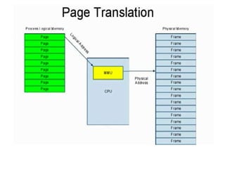 The document discusses various topics related to memory management in operating systems including swapping, contiguous memory allocation, paging, segmentation, virtual memory concepts like demand paging, page replacement, and thrashing. It provides details on page tables, segmentation hardware, logical to physical address translation, and performance aspects of demand paging. The key aspects covered are memory management techniques to overcome fragmentation and enable efficient use of limited main memory.