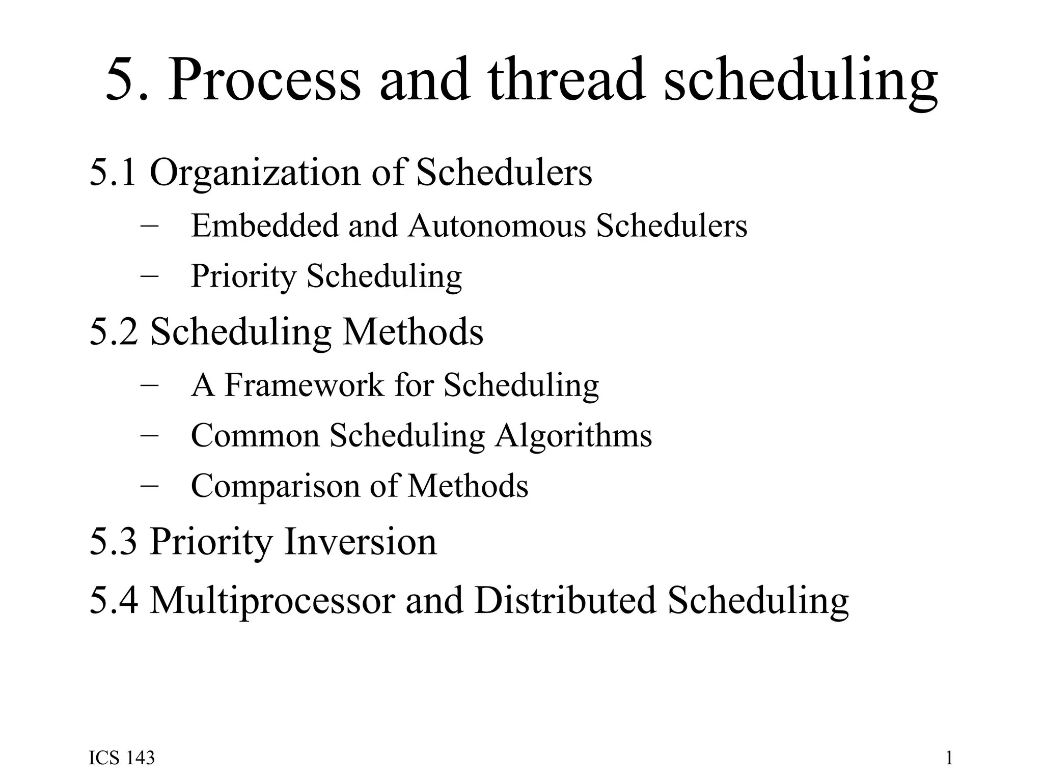The document discusses various process and thread scheduling methods. It covers the organization of schedulers, common scheduling algorithms like priority scheduling, and comparisons of scheduling methods. It also describes the priority inversion problem and solution of dynamic priority inheritance to prevent lower priority processes from indefinitely blocking higher priority processes.