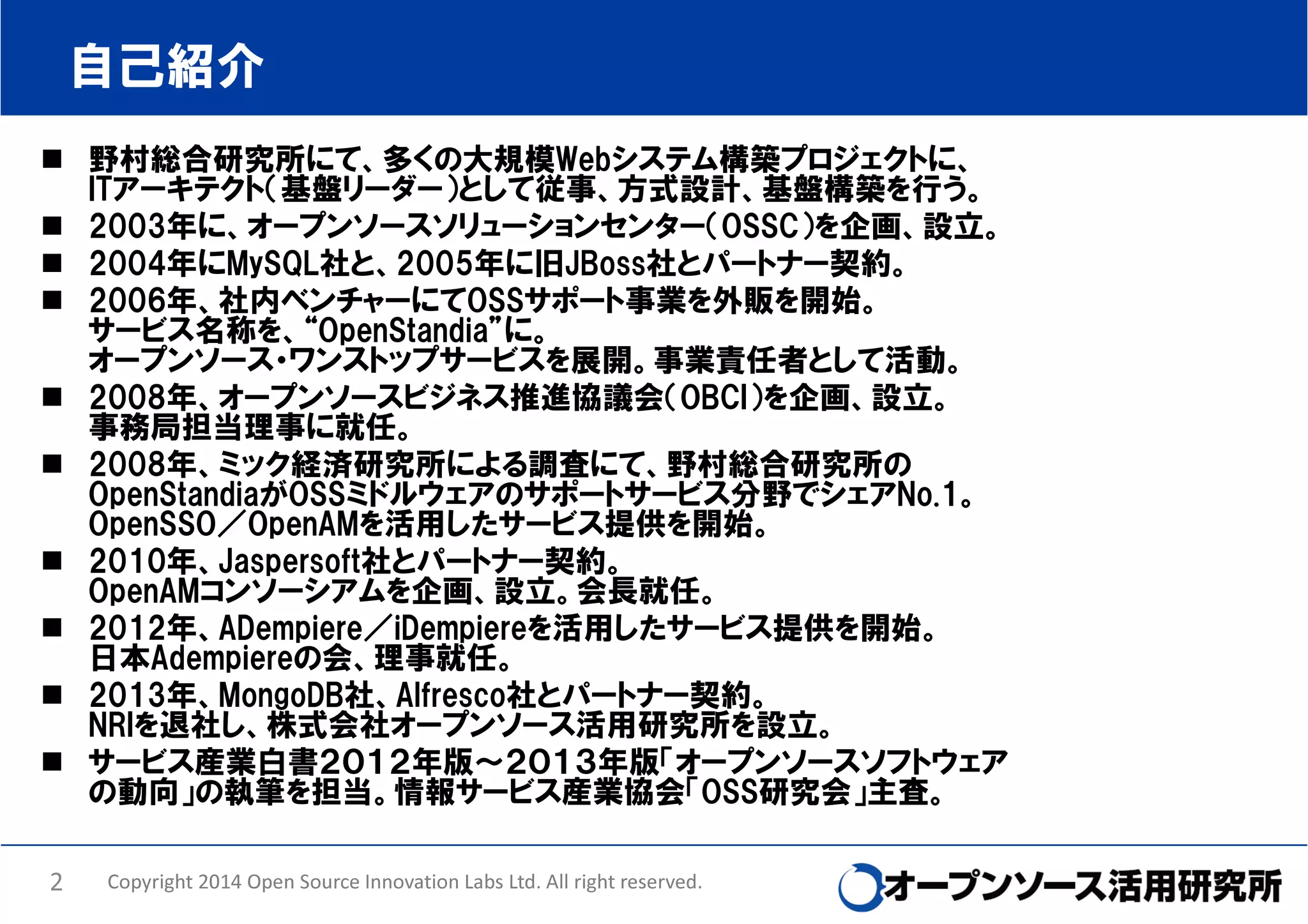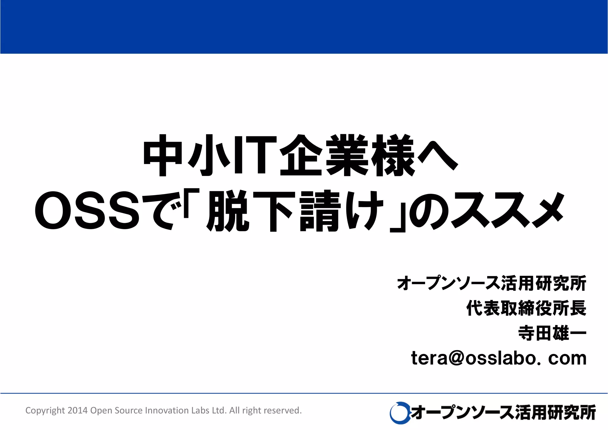 「SIはオワコン」と言われている。2015年特需(マイナンバー対応等)の後はどうなるのか。 大手企業が直接中小IT企業やフリーランスのエンジニアに直接委託するようになる時代、OSSで 自社の強みを構築し、プロモーションを行い、顧客企業に選ばれる存在になるために、何をするべきか? 野村総合研究所でオープンソース・ワンストップサービスOpenStandia事業責任者を務めた寺田雄一が解説。