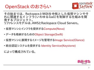 Servers。 • 仮想マシンとインフラを提供するCompute(Nova) • データを格納するためのObject Storage(Swift) • 仮想マシンに展開するイメージを管理するImage Service(Glance) ● 統合認証システムを提供する Identity Service(Keystone) によって構成されている。 2
