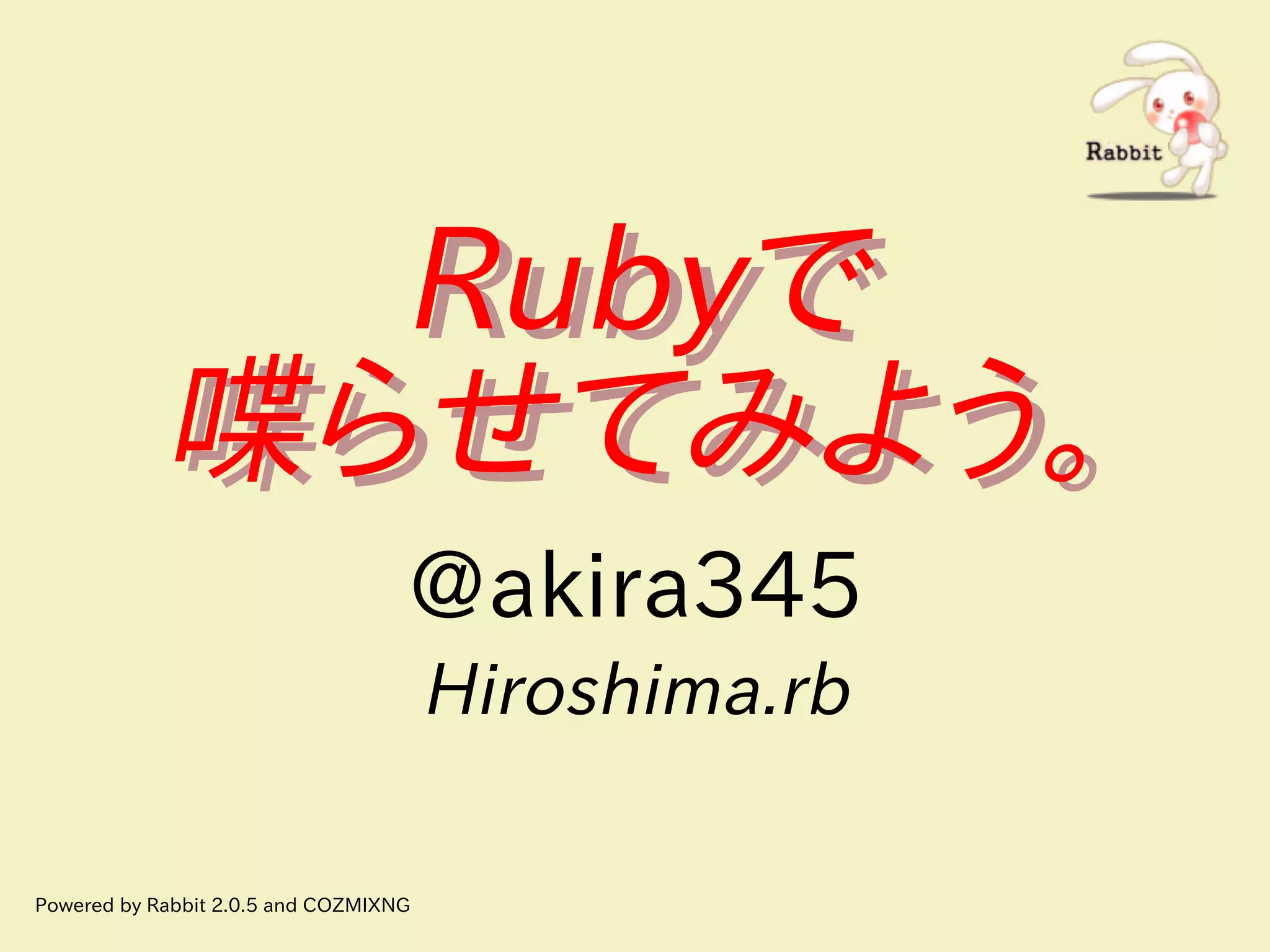 喋らせてみよう。 @akira345 Hiroshima.rb Powered by Rabbit 2.0.5 and COZMIXNG