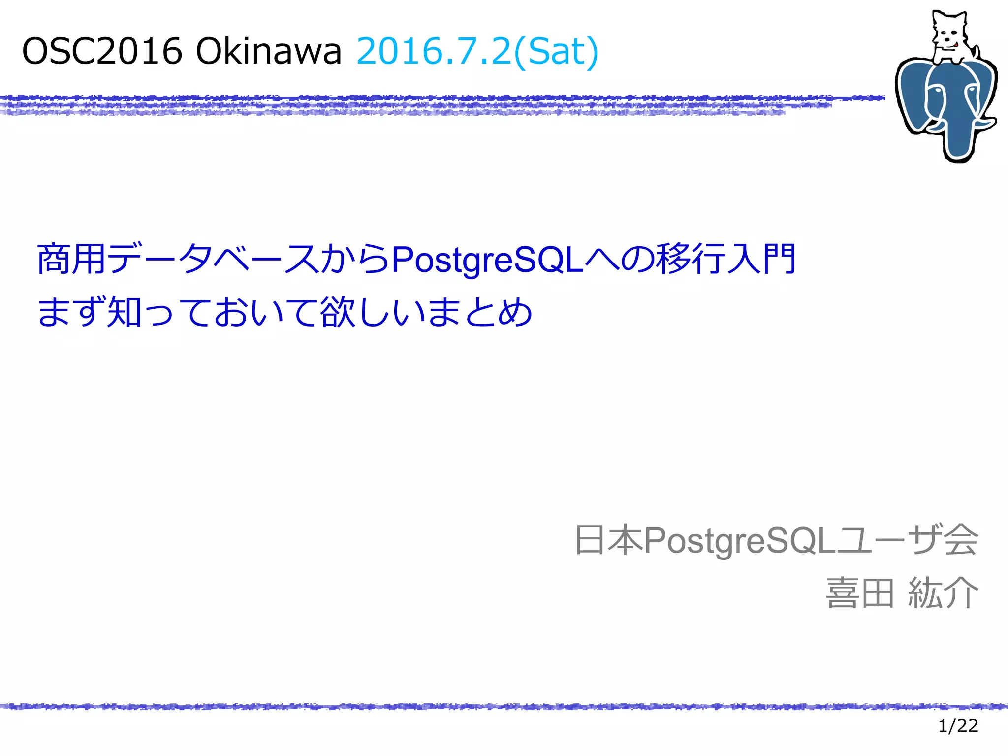 1/22 OSC2016 Okinawa 2016.7.2(Sat) 商用データベースからPostgreSQLへの移行入門 まず知っておいて欲しいまとめ 日本PostgreSQLユーザ会 喜田