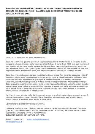 Oscar è un labrador di 13 anni, chiuso in un canile da 11 anni, dove ha sofferto enormemente. Nonostante la sua difficile vita, Oscar è affettuoso e cerca contatto umano, mostrando di essere in grado di donare amore. È adottabile nel nord e centro Italia ed è in cerca di una casa che possa offrirgli felicità e attenzione.