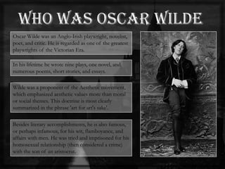 Oscar Wilde was an influential Irish playwright, poet, and author during the Victorian era. He wrote plays, poetry, novels, and essays that emphasized aesthetic values over moral themes. Wilde was also known for his flamboyant personality and wit. He had affairs with men, which led to his imprisonment for homosexual acts that were illegal at the time. The Picture of Dorian Gray is considered his most famous work, a Gothic novel that tells the story of a man whose portrait ages instead of himself as he engages in hedonism and immoral acts. The characters include Dorian Gray, the beautiful subject of a portrait; Lord Henry, who influences Dorian with his philosophy of indulgence; and Basil
