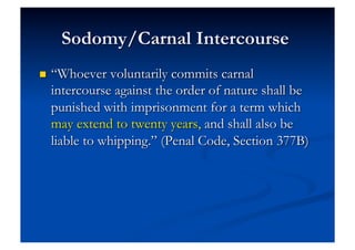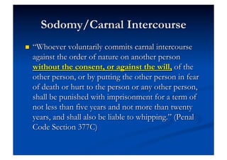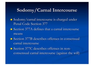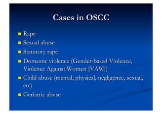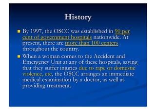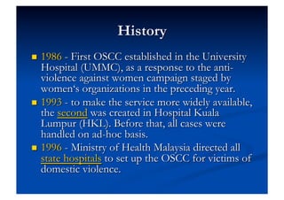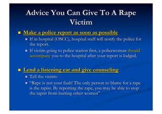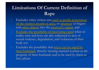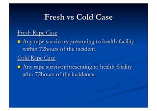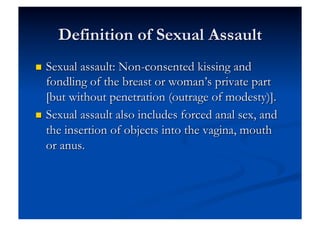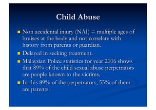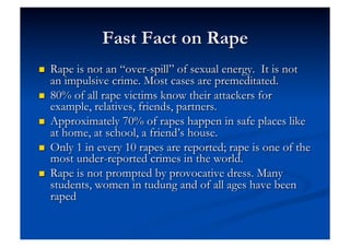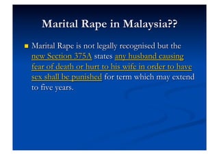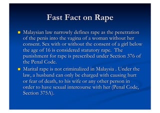 The document discusses various statistics and facts related to rape and sexual abuse in Malaysia between 2000-2007. It notes that the number of reported rape cases increased over this period, with 3,098 cases reported in 2007. It also provides a breakdown of cases by age, with most victims being below 16 years old. The document also references domestic violence statistics and discusses some of the laws related to marriage, child abuse, and definitions of rape under Malaysian law.
