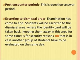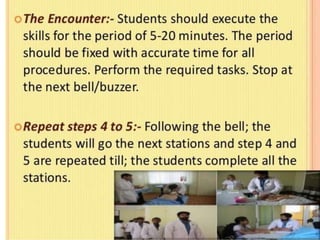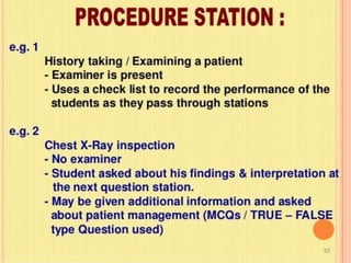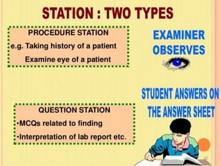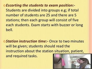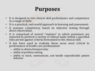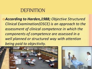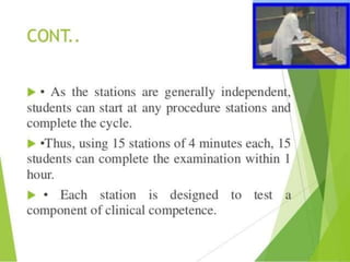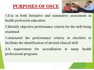 OSPE is an objective assessment tool used to evaluate students' practical skills in preclinical subjects like physiology. It consists of multiple stations where students perform tasks and are scored based on a standardized checklist. OSPE aims to make practical exams more objective and standardized compared to traditional oral exams. It assesses students' psychomotor and practical application abilities in a structured format.