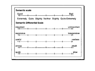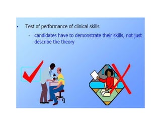 The document discusses Objective Structured Clinical Examination (OSCE) and Objective Structured Practical Examination (OSPE) as assessment tools for evaluating clinical skills. It defines OSCE and OSPE, describes their methodology using examples of stations, and discusses their advantages and disadvantages. The document also covers the Semantic Differential Scale used to measure psychological meanings and attitudes towards concepts using bipolar adjective scales. It discusses the history, methodology, usage and factors of the Semantic Differential Scale.