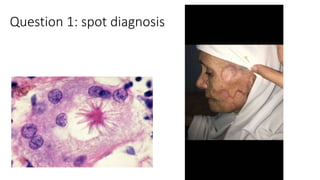 This document outlines an OSCE exam for a dermatology unit consisting of 30 questions testing spot diagnoses of skin lesions and listing differential diagnoses. Questions also cover appropriate investigations, diagnoses, and treatments including use of CD34 staining and laser wavelengths for tattoo removal.