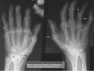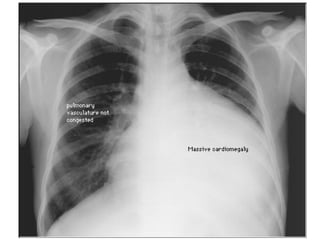 The document describes various radiological findings seen on imaging studies like CXR, CT, MRI etc. It provides descriptions of abnormalities seen in conditions like pulmonary edema, pneumonia, pneumothorax, bronchiectasis, pancreatic cancer, renal calculi, intestinal obstruction, rheumatoid arthritis, cerebral hemorrhage, subdural hemorrhage, thymoma, atrial flutter and atrial tachycardia among others. It also lists the possible causes and differentials for these conditions.