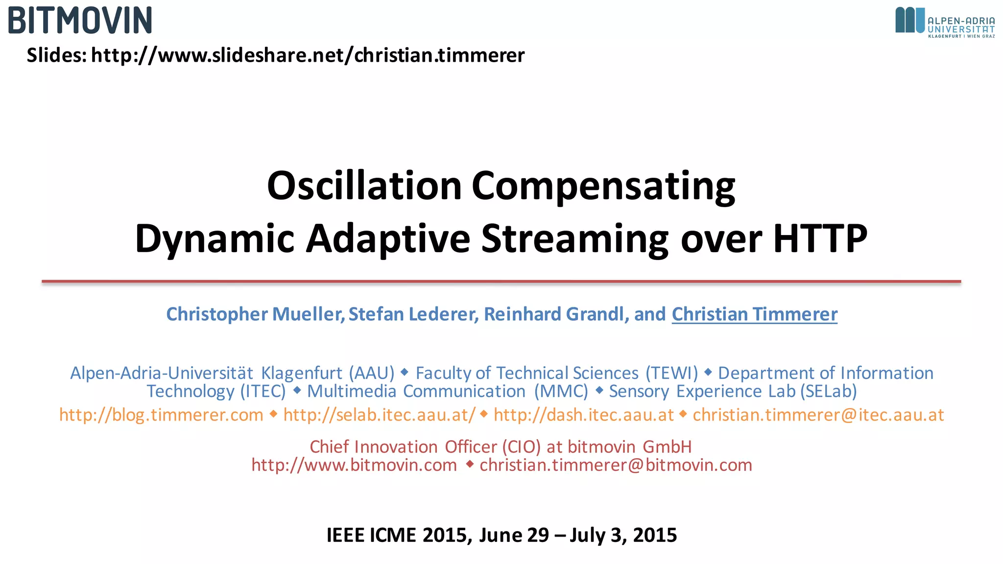 This document discusses oscillation compensation in adaptive streaming over HTTP. It presents a buffer-based adaptation algorithm that detects quality switching oscillations between clients. When oscillations are detected, the algorithm compensates by restricting quality level changes based on the fill state of the playback buffer and an oscillation factor. Experimental results show the approach reduces quality switching variance and improves streaming performance compared to a traditional throughput-based adaptation approach. Future work will evaluate the method at larger scales.