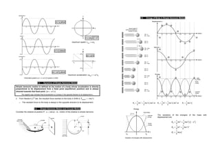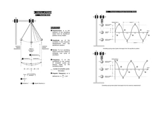 This document discusses oscillations and simple harmonic motion. It defines key terms like period, frequency, displacement, and amplitude. It describes the kinematics and dynamics of simple harmonic motion for a spring-mass system. Specifically, it states that the acceleration of an object in SHM is directly proportional to and opposite of its displacement from equilibrium. It also discusses the energies involved, including kinetic, potential, and total energy, and how they vary with displacement. Damping is described as causing the amplitude and total energy to decrease exponentially over time. The interaction of an oscillating system with an external periodic driving force is also summarized.