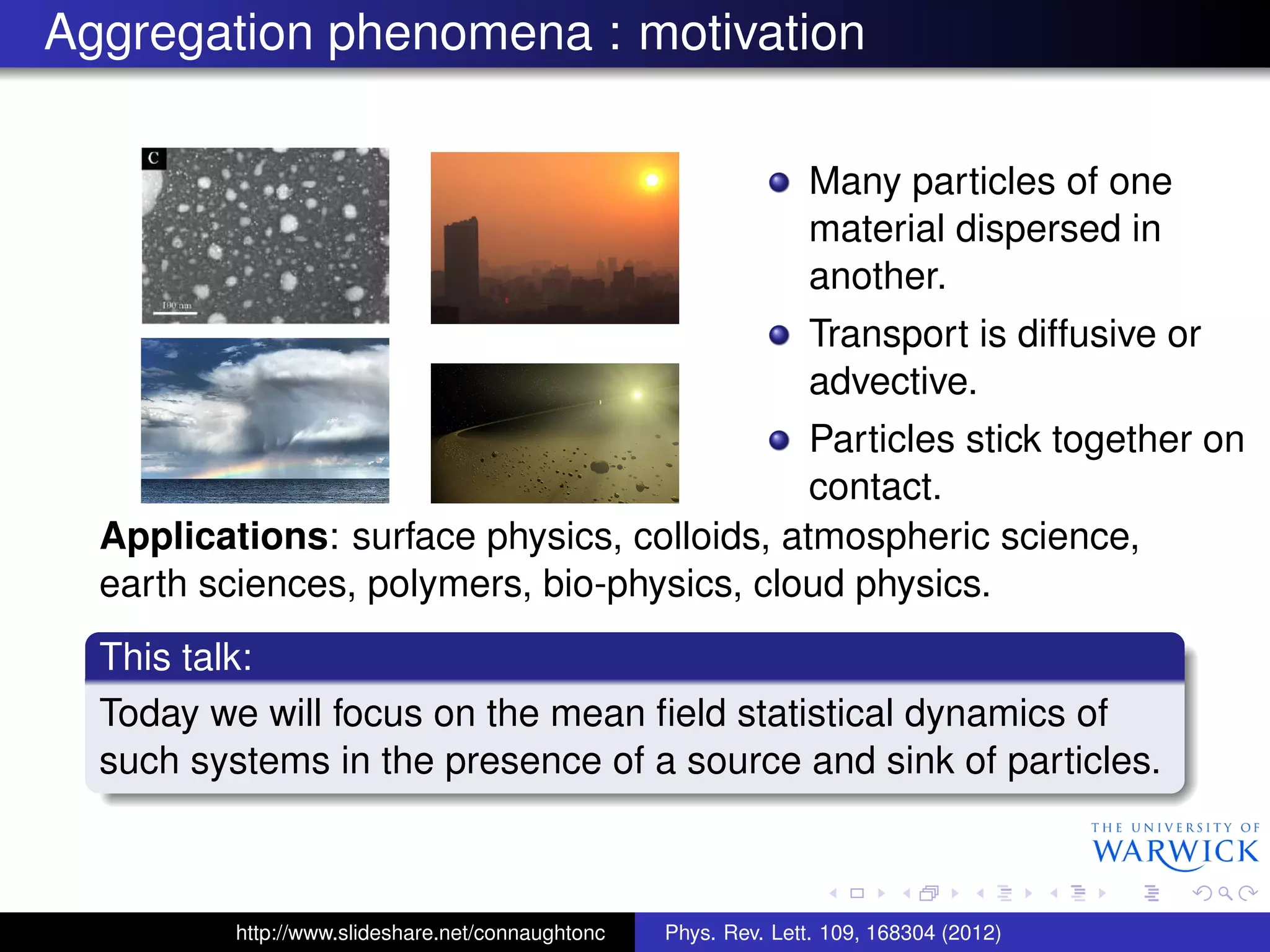The document discusses the mean field statistical dynamics of cluster-cluster aggregation, focusing on the Smoluchowski equation under conditions of particle sources and sinks. It presents findings on the stationary solutions, stability analysis, and oscillatory behaviors within nonlocal kinetic equations. Key questions are raised about the applicability to physical systems and potential for future research in oscillatory kinetics.