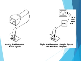 The document provides an overview of the oscilloscope by explaining that it is a graph-displaying device that draws a graph of an electrical signal over time, with voltage on the vertical axis and time on the horizontal axis. It then describes how an oscilloscope can be used to determine signal parameters like frequency, see circuit components represented by a signal, check for signal distortions, and more. The document also summarizes how analog and digital oscilloscopes work and key oscilloscope specifications and controls.