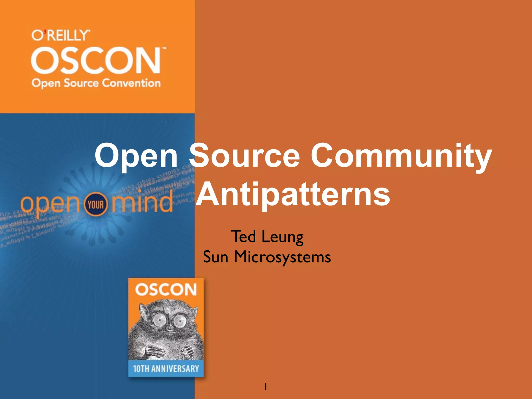This document outlines antipatterns that can harm open source communities. It discusses issues related to governance, communication, culture/environment, merit, decision making, leadership, balancing forces, and other concerns. Specific antipatterns mentioned include having too much or too little governance, keeping community operations private, being restrictive about approved communication channels, failing to actively pass on culture to newcomers, prioritizing rules over guidelines, making criteria for success vague, creating an unfriendly environment, believing merit can be absolutely measured, ignoring leadership needs, being partisan, making community building someone's job rather than developers, and centralizing by giving people turf. The document aims to help open source communities avoid these pitfalls.