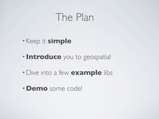 This document provides an introduction to geospatial Ruby libraries. It begins with three geography lessons: vector data types and OGC simple features, spatial relationships, and spatial reference systems. It then discusses several geospatial Ruby libraries including GEOS, GeoRuby, RGeo, and spatial database adapters. It also covers location-based APIs and services like Twitter, Instagram, Yelp, and Fusion Tables that can be used to generate geospatial data. Finally, it discusses the GeoCommons gem and platform for geospatial data storage, analysis, and visualization.
