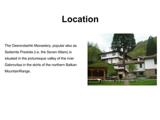 The Osenovlashki Monastery, also known as Sedemte Prestola, is located in northern Bulgaria near the Balkan Mountains. According to legend, it was founded in the 11th century by seven boyars who settled with their families in the region. During Bulgaria's struggle for liberation, the monastery sheltered revolutionaries like Vassil Levski. Today, the functioning monastery has a central church surrounded by a stone wall, residential buildings, and a well-maintained garden. The church contains seven altars dedicated to Bulgarian saints, with wall paintings over 100 years old. The monastery is open for visitors to see its unique architecture and icons.