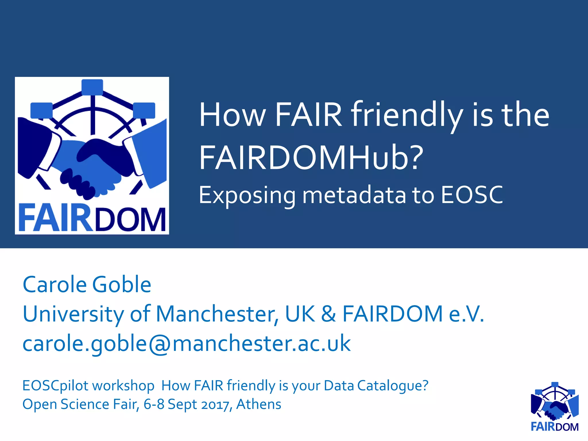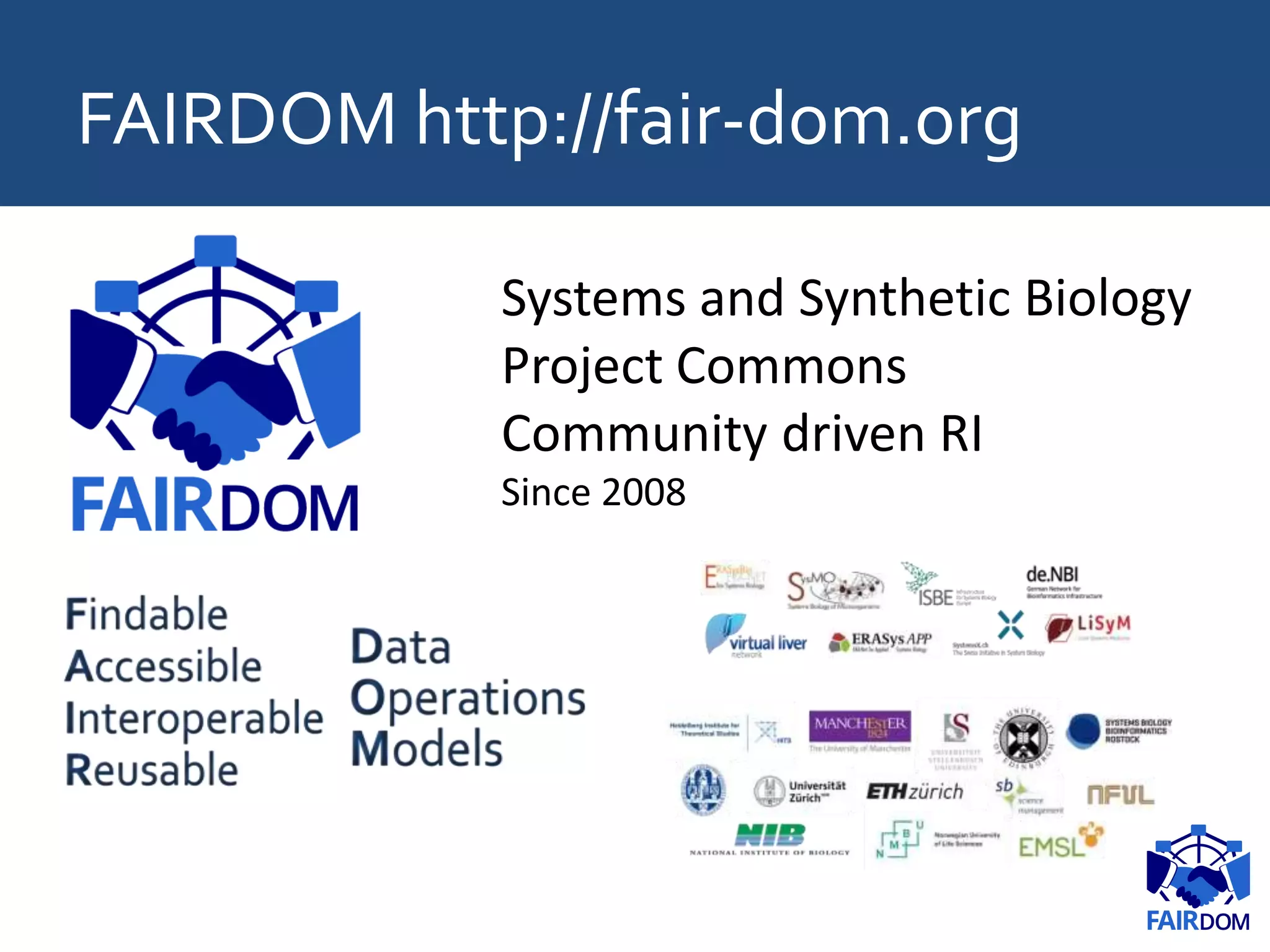 The document discusses the FairDOMHub and its role in facilitating FAIR (Findable, Accessible, Interoperable, Reusable) data sharing within the community of systems and synthetic biology. It outlines the structure and features of the FairDOMHub, including project management, metadata frameworks, and accessibility measures for research data. Key topics include data cataloging, versioning, and the importance of interoperability in data repositories.